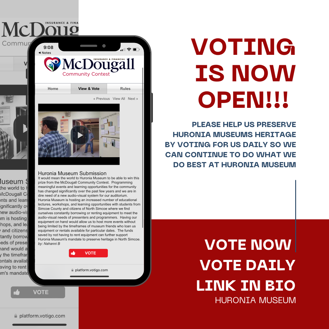 We have entered the McDougall Community Contest with our 2 min short video and we are looking for our beautiful community support to help us win so we can continue to preserve Huronia Museum Heritage. We are grateful for Bryan from Huronia Museum who created our video for the contest and we can’t wait for you to see it as we know you will giggle just as much as we have been!