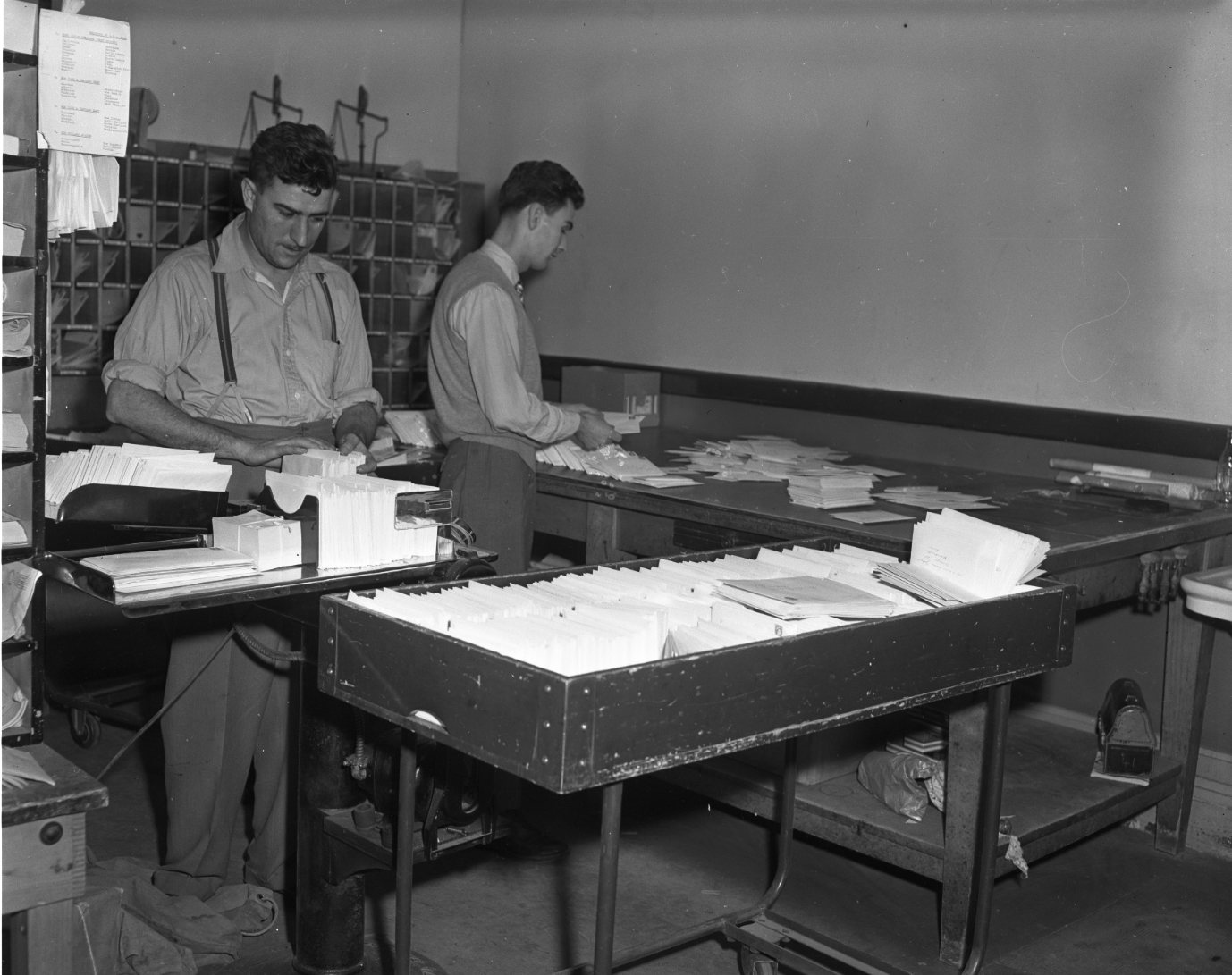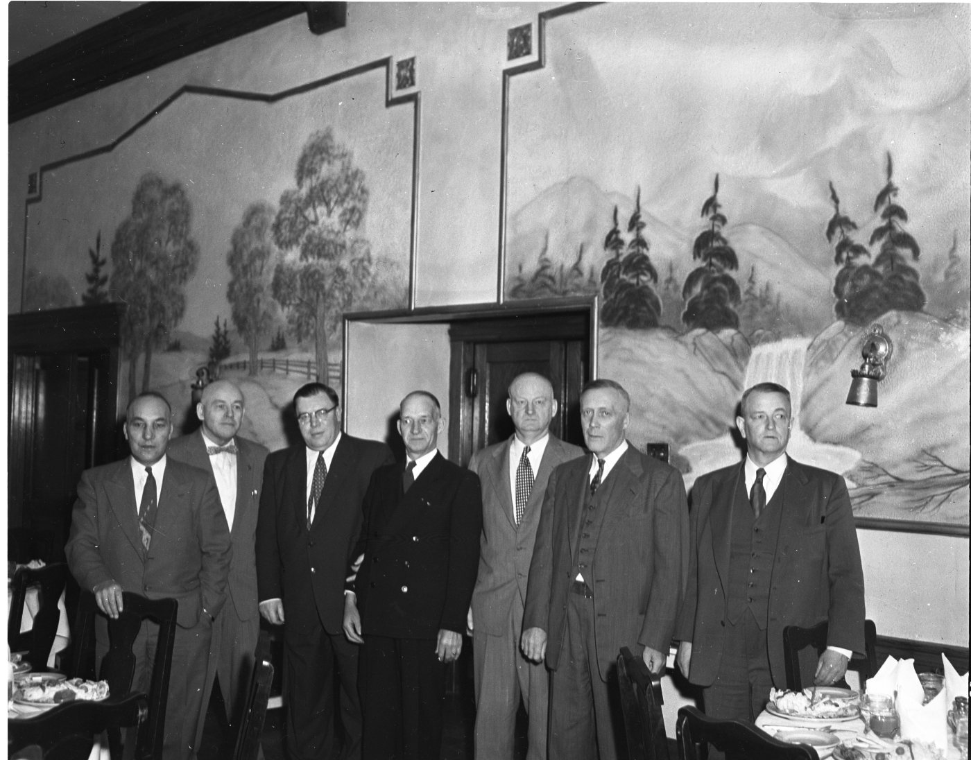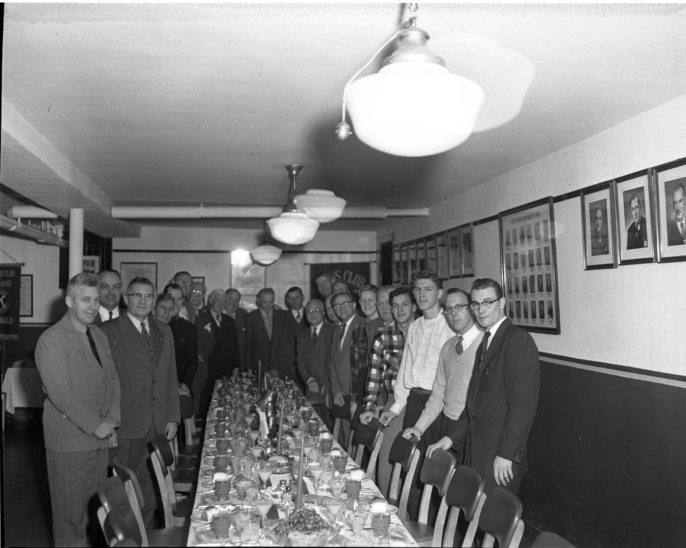 Assembled around the Christmas table, Midland Kiwanians and guests gather to enjoy a meal. Included in the group are; Mayor Charles Parker, Harvey White, J. J. Robins, Dave Haig, Capt. Ray Smith, Gordon Moss, C.A. Walkinshaw, Roy King, Al Perkins, Walter Zapletal, Bill Shaver, Police Chief William Nicholson, John Gorgan, R.G. Gilles, Stan Brooks, Bill Bates, Hec Kilroy, Ted Mitchell, John Richardson, Charles Palmer and Al Hume.