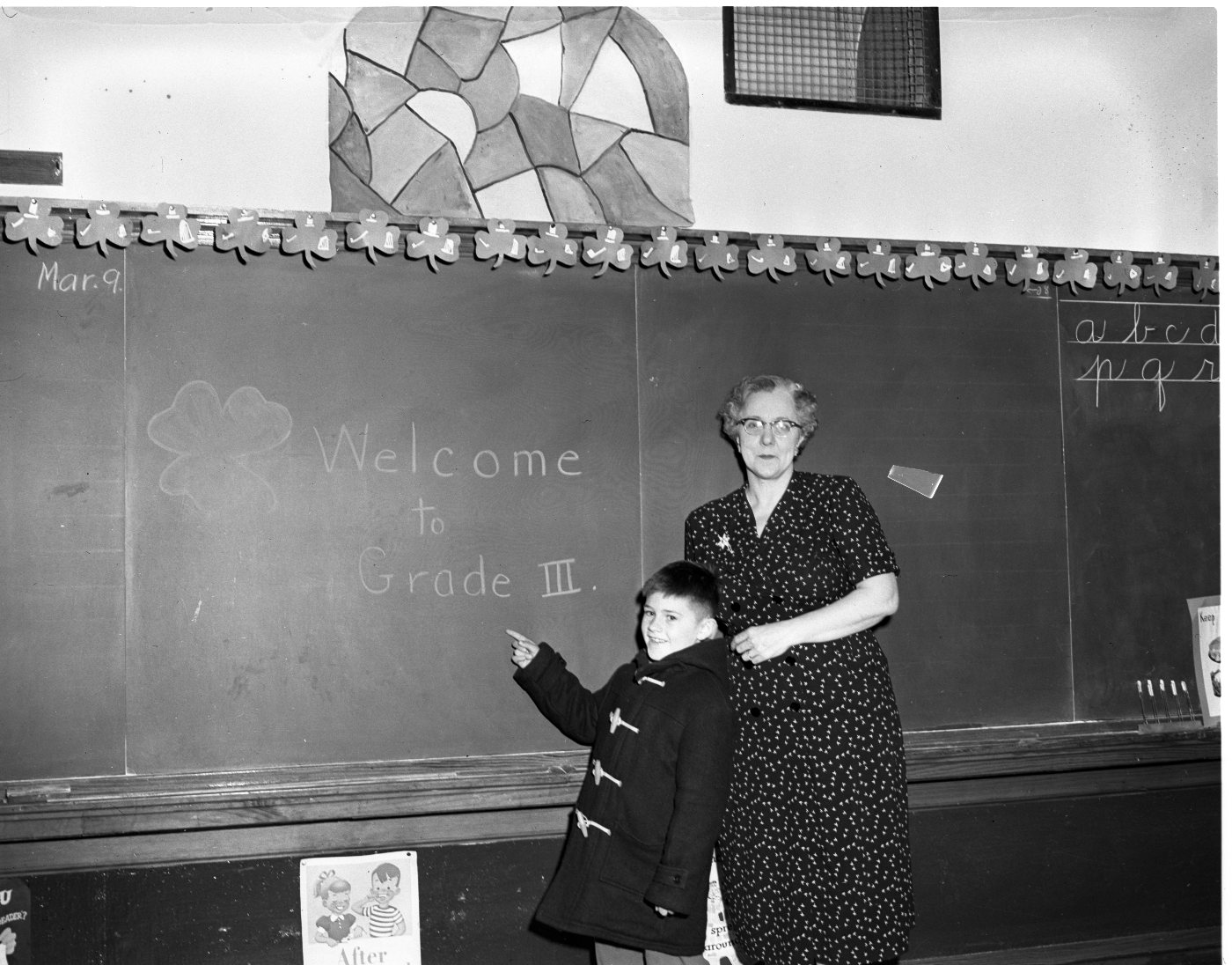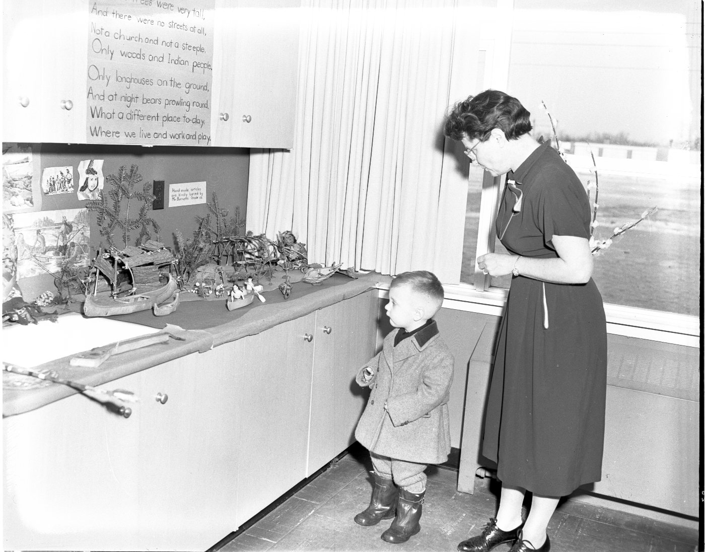 Official opening of the new addition to Regent Public School. Jamie Lounsbery shows his mom and dad, (Mr. & Mrs. Ted Lounsbery) what he has been doing in his work book. Looking on is his teacher Mrs. Ken Trew.