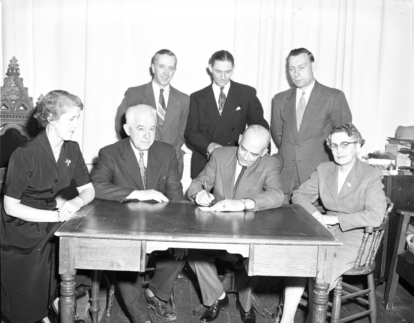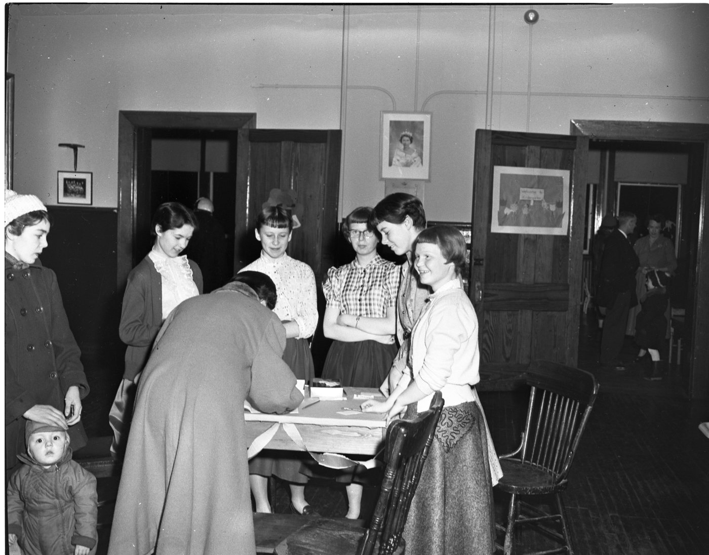 YMCA annual fundraising campaign starts Monday, goal $8,000.00. Phiat Club members, formerly the High-Y Grads Club plan their part of the drive. L to R, Grace Edgar, Helen Laidlaw, Mrs. Ross Thompson (Doreen), Mary Arbour, Elaine Gerow and Eleanor Chornoboy