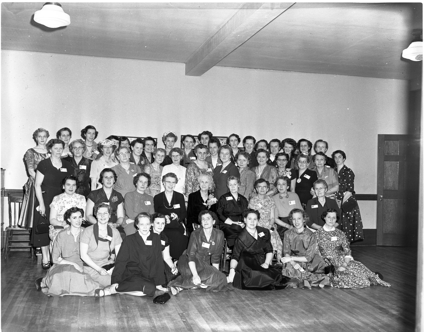 Inter club badminton tournament between Midland Garrison Club and Orillia at the Midland Armory. From Orillia in front row, Helen Richardson, Erma Trask and Shirley Acheson. Midlanders in the back row, Joyce Rutherford, Shirley Thompson, Helen Laidlaw, Grace Edgar, Aileen Shaver and Helen Lewis.