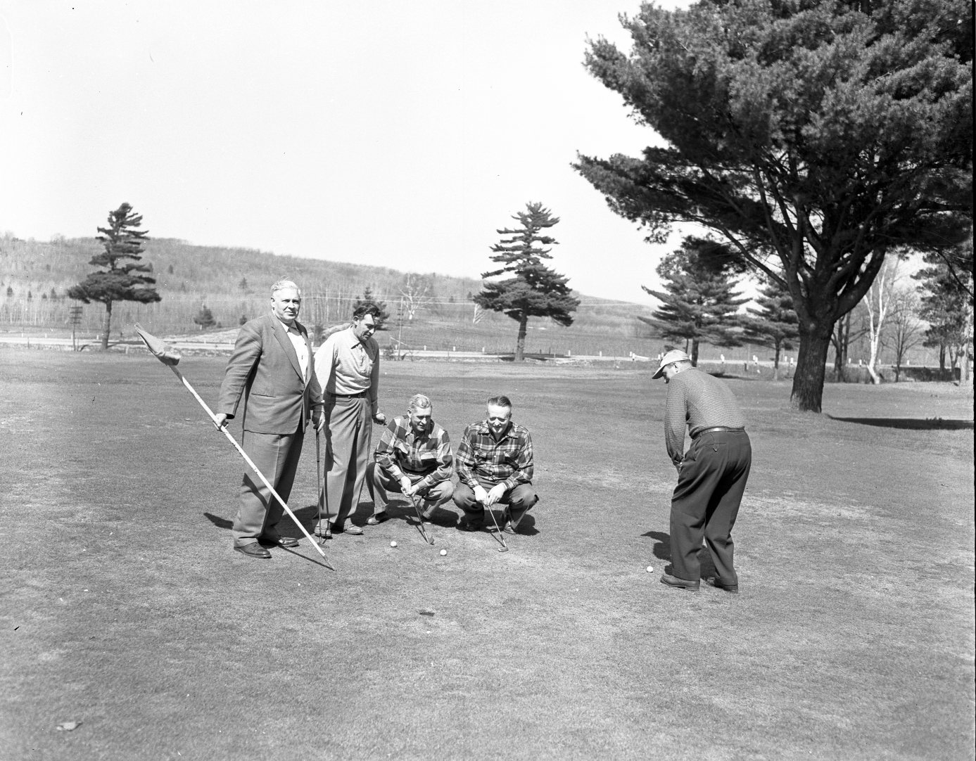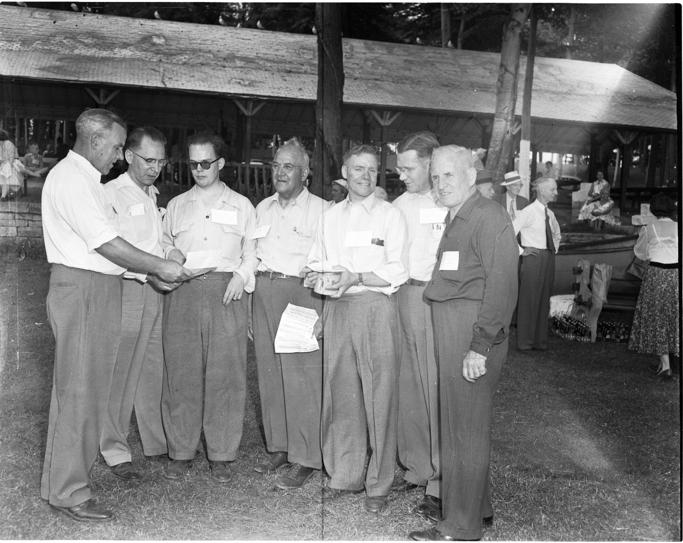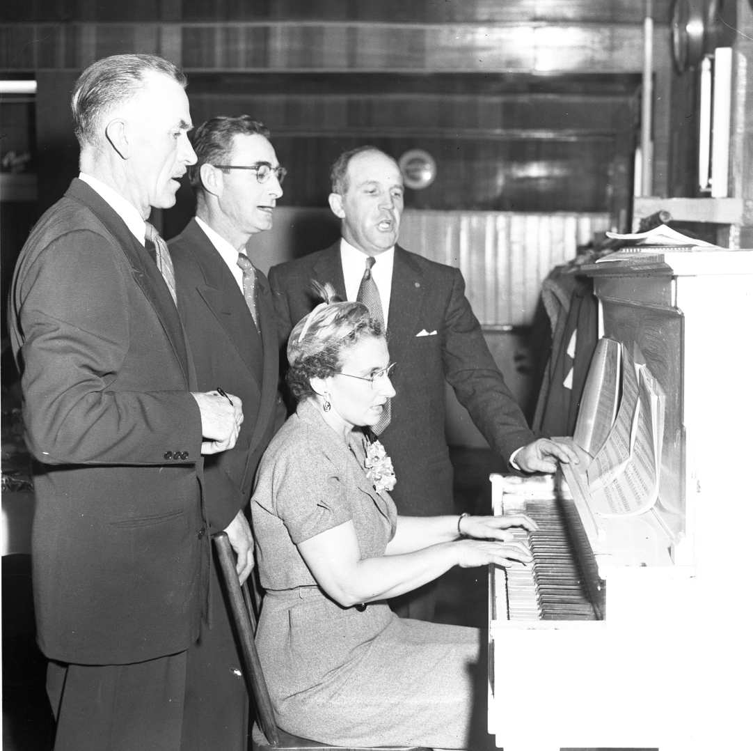 Annual potato banquet, entertainment provided by this Lafontaine group at the Parkside Inn, Henry Beauchamp, Ovila Desroches, Anatole Charlesbois and Mrs. Charlesbois at the piano.