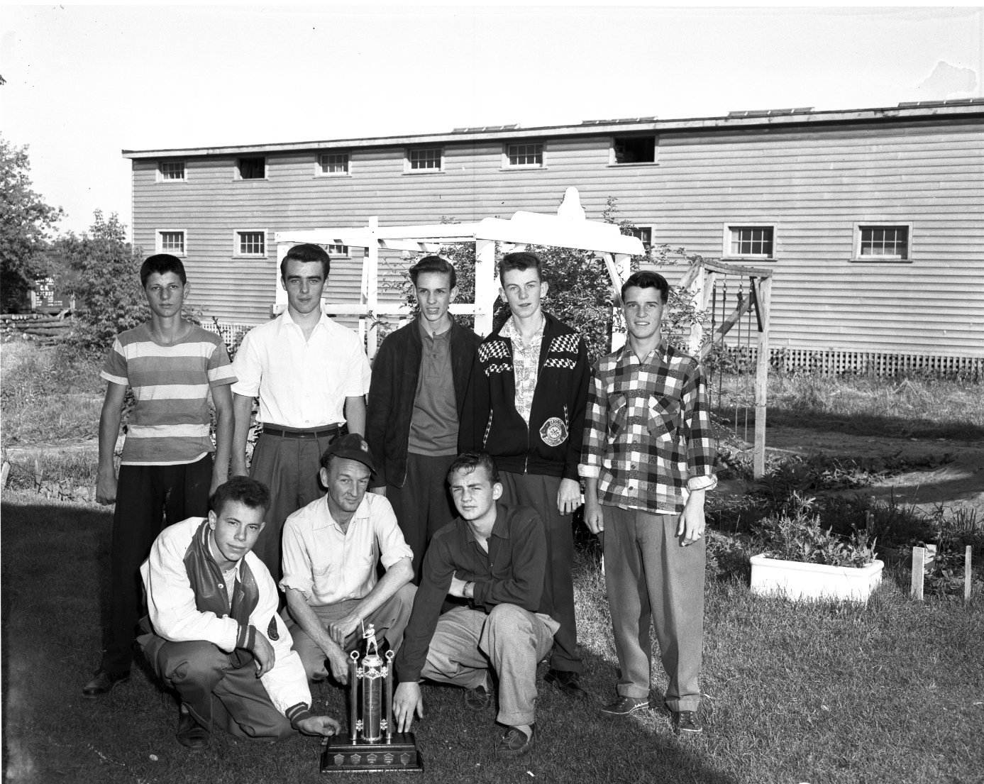 Arthur Gardiner president of the North Simcoe Crop Improvement Association presents prizes to members of the Lafontaine 4-H Potato Club at a dinner held at the Parkside Inn , Midland, Tuesday night. First prize is given to the youngest lad Gabriel Desroches. Front row, Richard Marchildon, Raymond Gignac, Donald Forget, Julien Maurice, Peter Laurin, Marcel Desroches, back row, Gabriel Brunelle, Mauril Laurin, Martin Maurice, Leo Forget, Gabriel Maurice, father of Martin & Julien, also Club Leader and Vital Vallee.