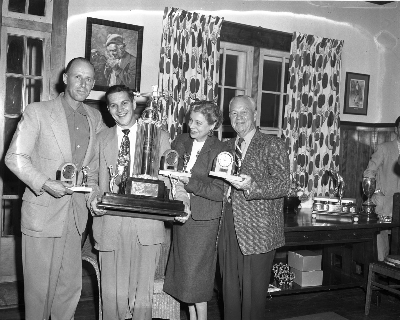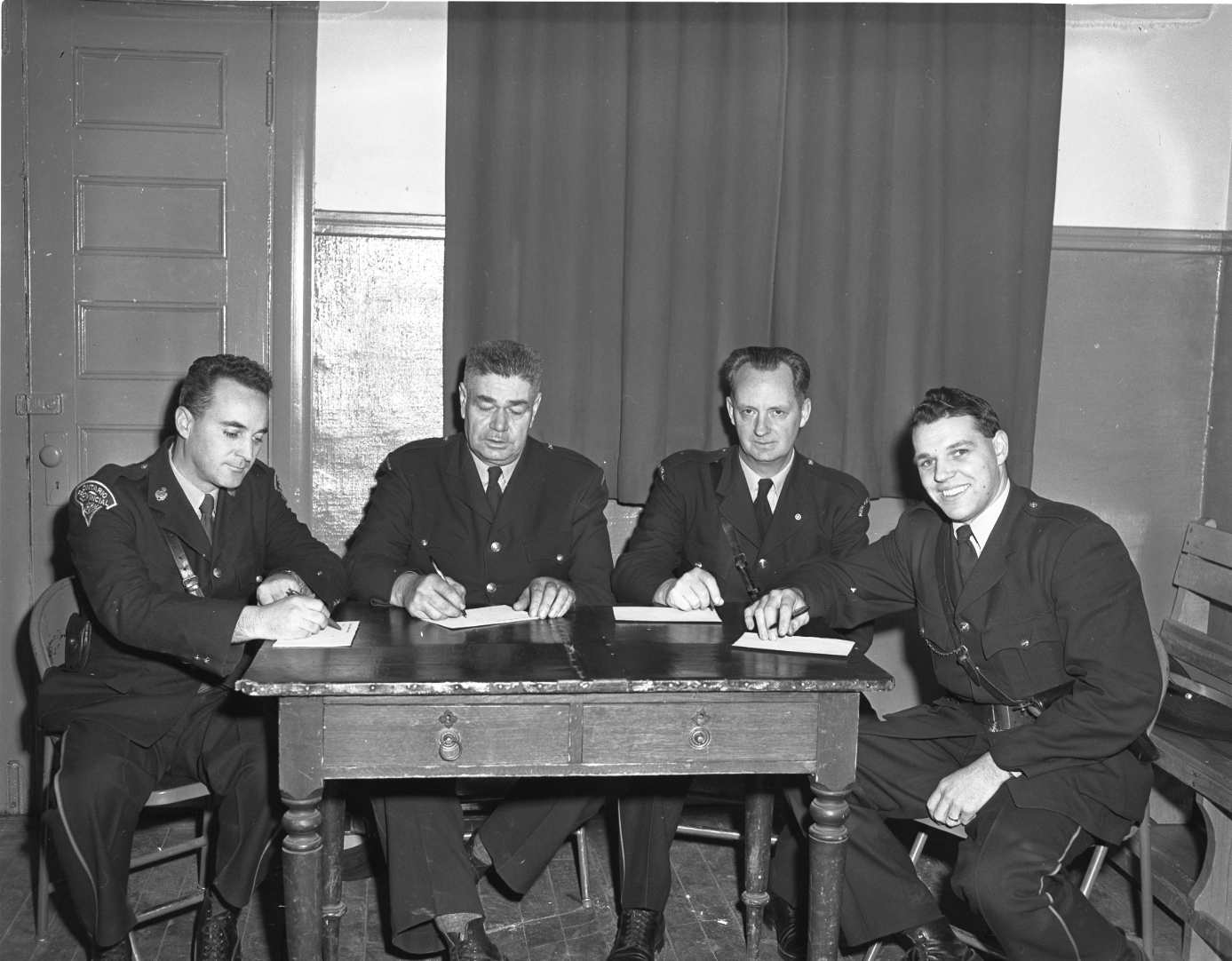 Planning second annual Simcoe County Police Association dance to be held at the Parkside Inn on Yonge Street. Provincial Constable Bill Mohan, Midland Chief William Nicholas, Constables George Wainman and Ernie Bates.