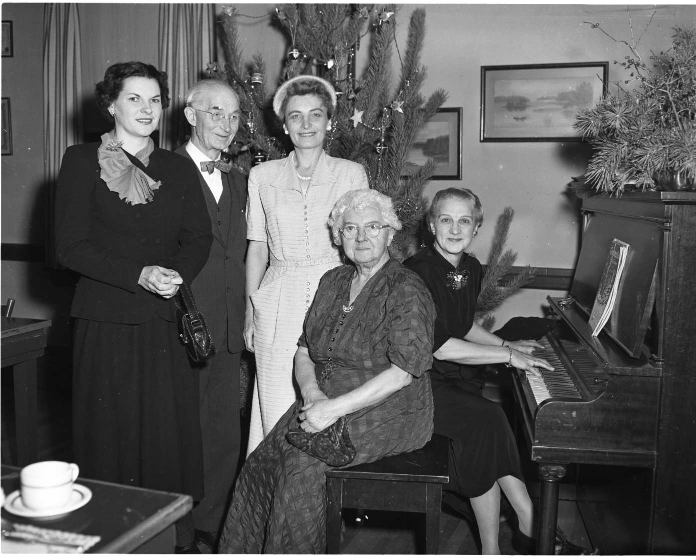 December 1955 at the Midland Penetang Advisory Committee of the CNIB Christmas party held at the Midland YMCA, ready for carol singing, Mrs. Bill (Joan) Barnett and William Steggles both of Midland, Mrs. W. L. Penton of Penetanguishene, seated Mrs. Ava Davey of Victoria Harbour and Miss May Wilkinson. Only Mrs. Barnett and Miss Wilkinson have full sight.