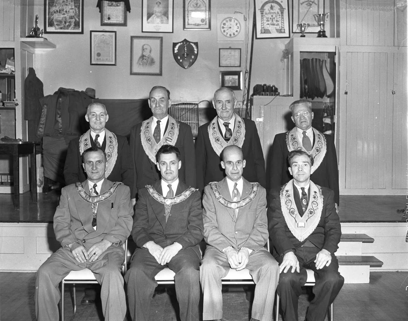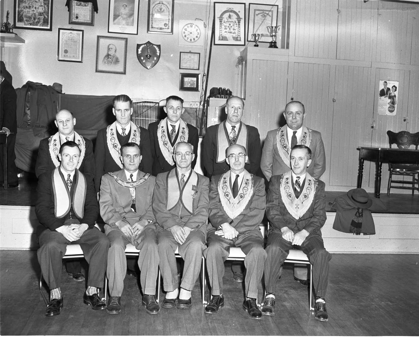 Junior Officers of LOL 947 Midland, front, Albert Magloughlin, William Rankin, Ernie Hurl committee men, Jack Crooke committee chairman, Omery Coudle lecturer, back, Fred Norwood tyler, Cecil Chapman sentinel, Rilson Stainton lecturer, Albert Atkinson committeeman, Michael Kelly associate lecturer.