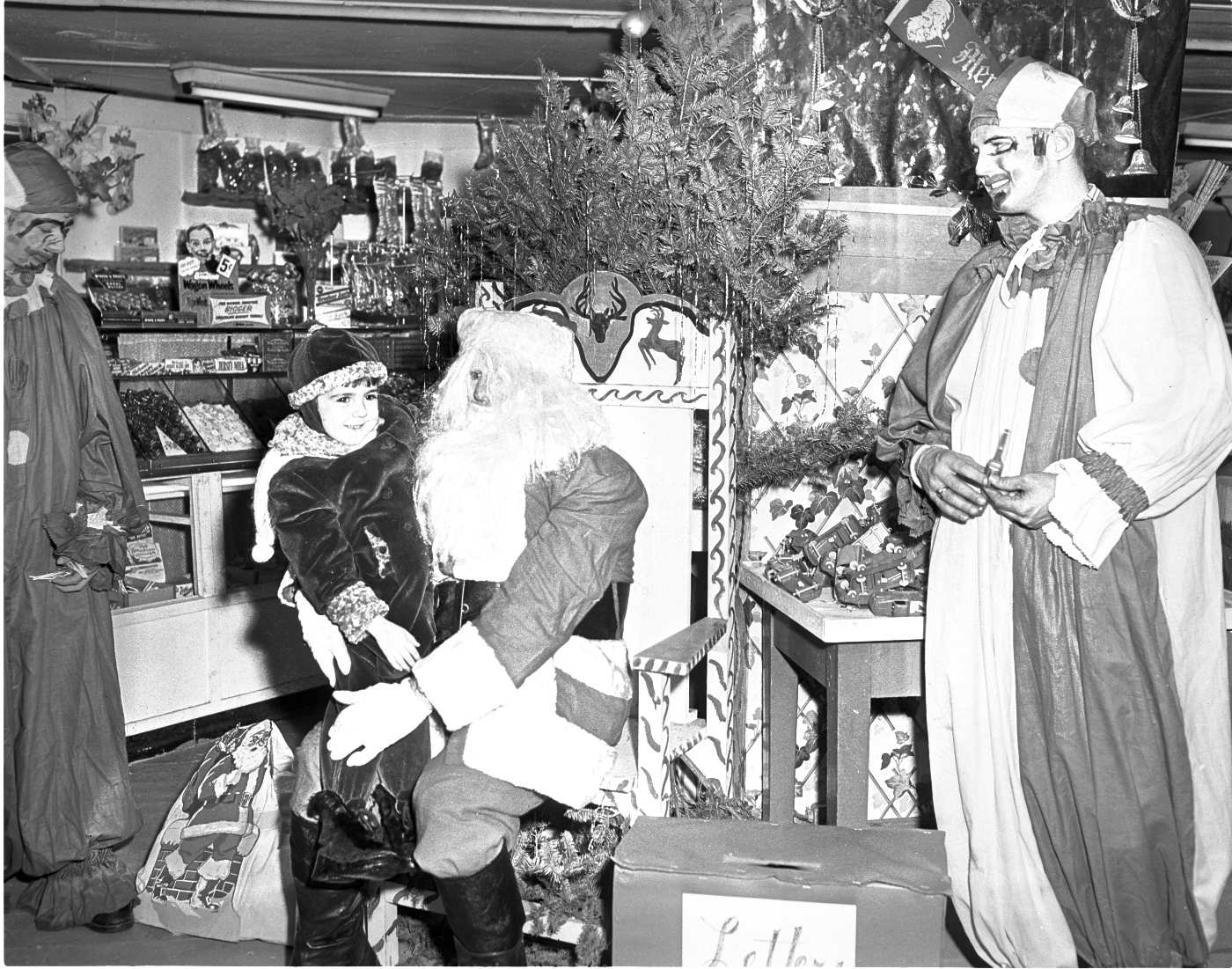 Joan Hamelin smiles on the knee of Santa while they discuss her gift, a doll maybe. How many of us had our first meeting with the jolly old man in the basement of Edwards Specialty Shop in Midland. The newspaper cropped out the two “elves”, maybe for good reason, if you know their identity let us know.