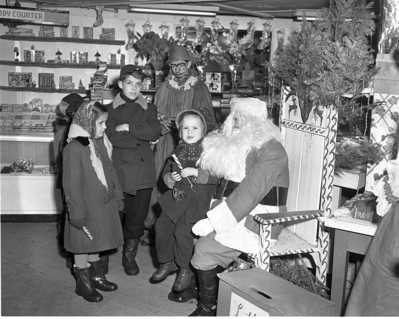 Santa makes a pre-Christmas visit to the Midland Armouries during the Legion Branch 80 Christmas party. Three hundred children of Legion members, under the age of twelve attended. The children of Mr. & Mrs. Duncan Douglas of George Street receive gifts, Marlene Douglas, Elgin Douglas, David Douglas and Barbara Douglas.
