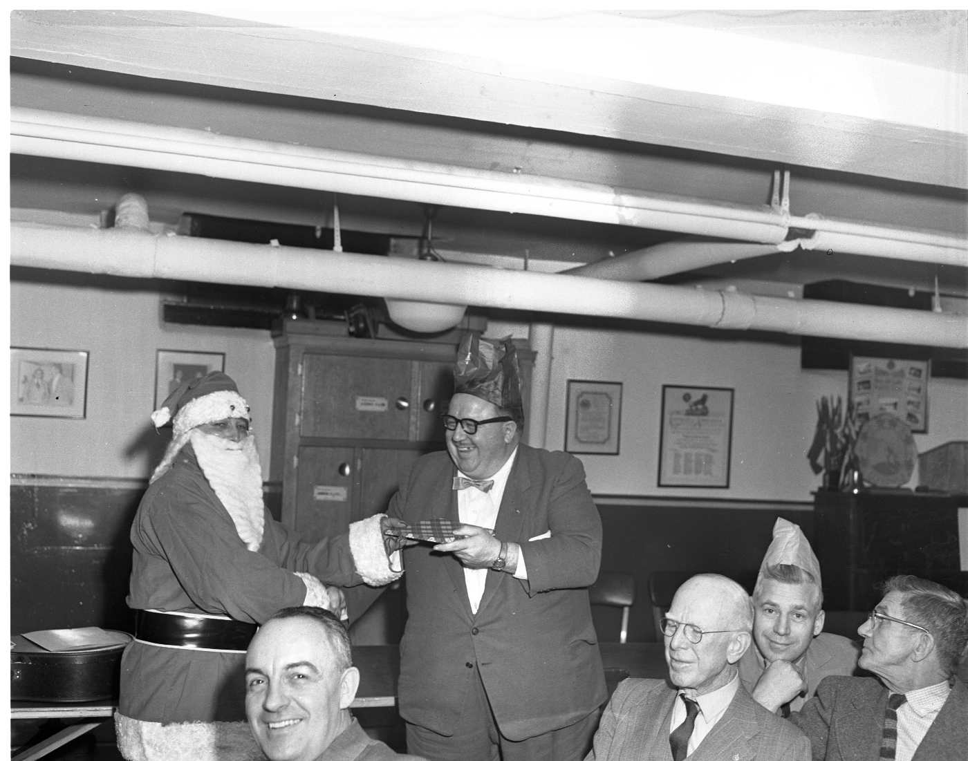 Santa visits Midland Kiwanians during their luncheon meeting. Bank manager R.G. Gilles receives a gift while president-elect C.A. Walkinshaw, Gordon Moss and Al Perkins look on.