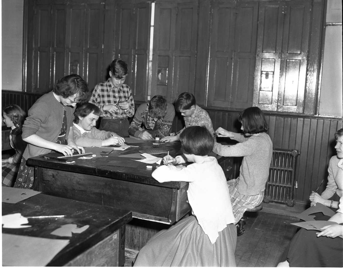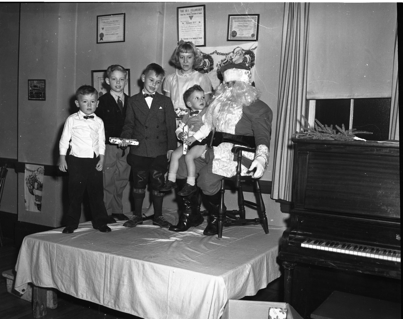 Santa Claus pays a pre-Christmas visit to the Midland YMCA. On Santa’s knee is John Thompson, other children from the left are Karl McAllen, Ken Trew, Tommie Attridge and Betty Ann McCullough.
