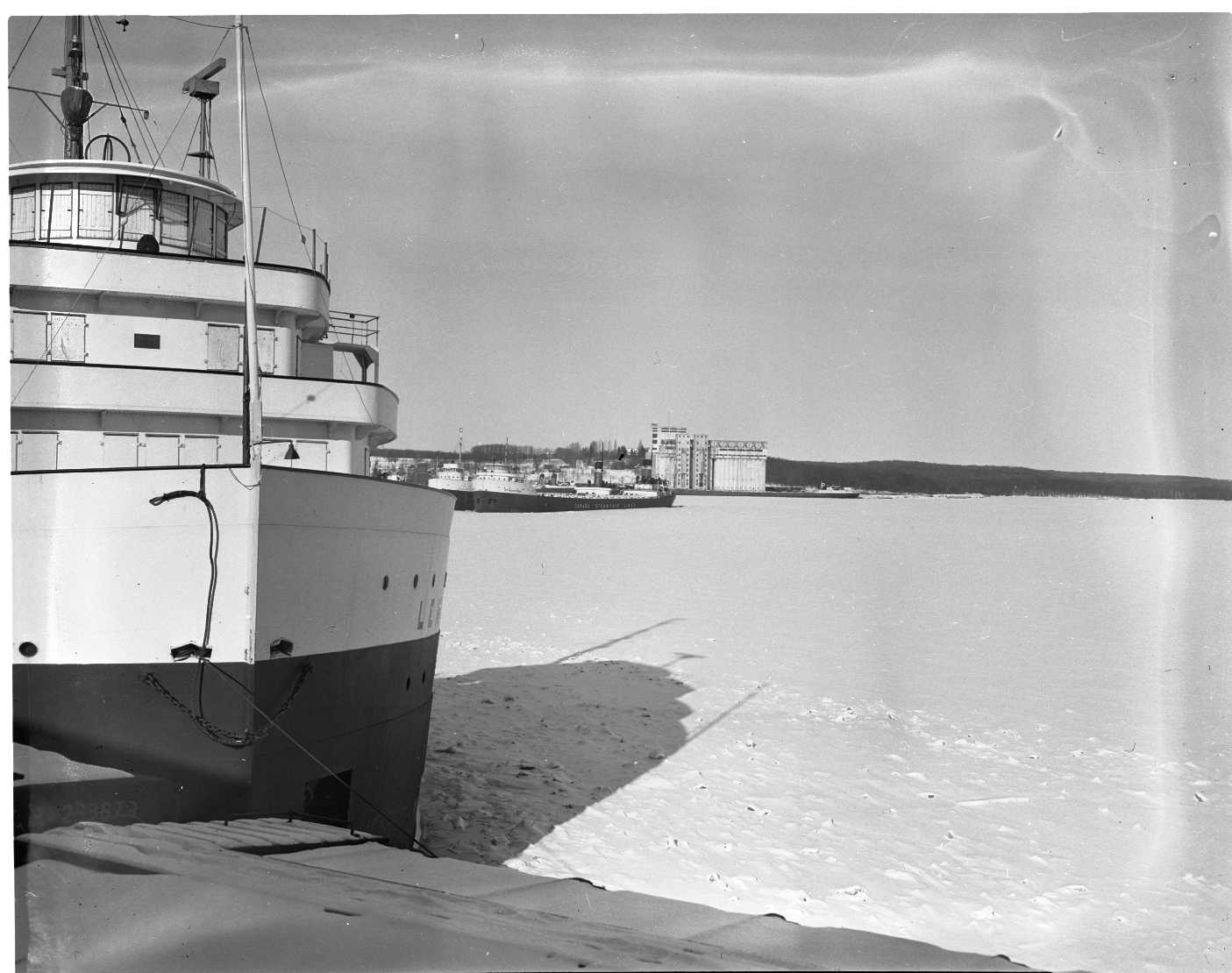 “Winter’s Prisoners” Snow covered super structure of the Lemoyne provides a frame for other ships of Midland’s winter fleet. At the CSL winter birth are the Hagarty and the Stadacona while across the bay at the Simcoe Elevator are the S.S. Paterson and two Mohawk Navigation Co. ships the Shaunghnessy and the Mohawk Deer.