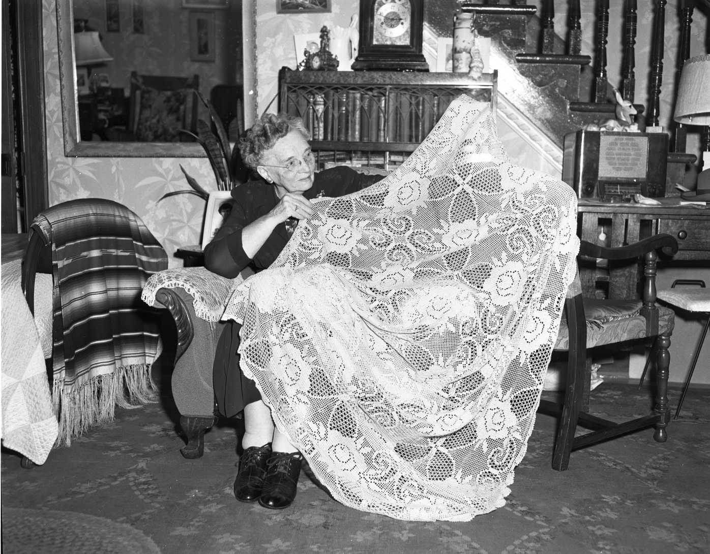 Mrs. Viola Leece Cornell, 78, of Coldwater displays one of her crocheted table cloths, 78 by 84 inches in size and requiring 6 months to complete. She estimates there is enough thread in one to stretch the 32 miles to Barrie and part way back.