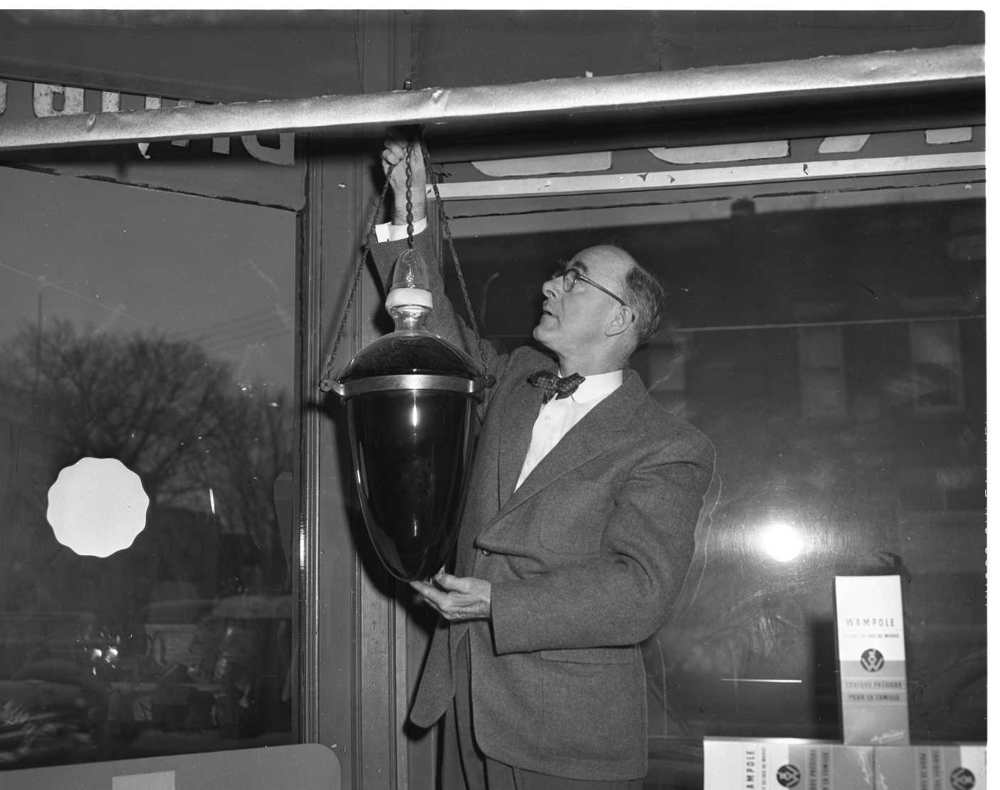 “Glow Bowl”, a symbol which once marked all the old time pharmacist shops. This one is hung in the shop of Mord S. Millard whose father, Charles G. Millard brought it to Coldwater in 1896. Filled with water and copper sulfate, it would glow.