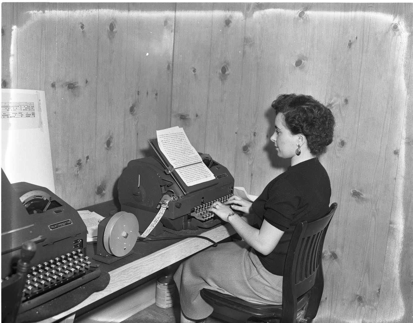 Mrs. K. V. Stephenson enters text into the new teletype-setter recently installed at the Midland Free Press. Keystrokes create perforations in the tape emerging from the machine that are then used to control the type setter.