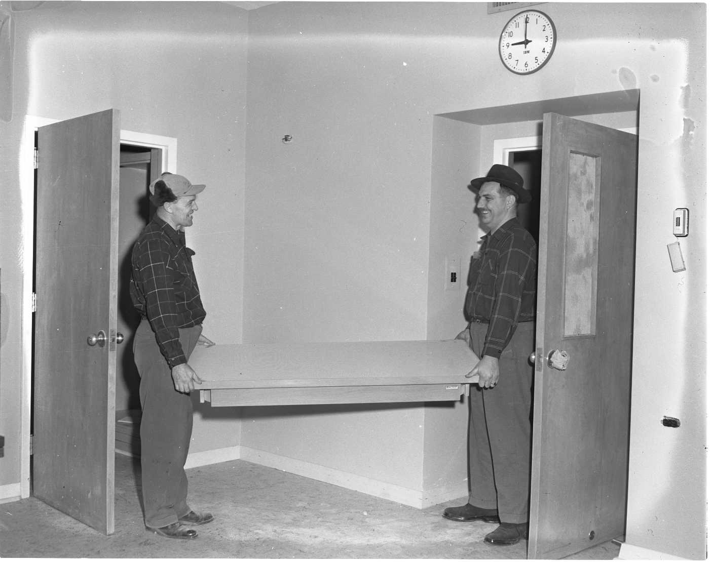 No Yule Holiday for them, Bill Elrick, left, and Len Wiles, caretakers of the combined Central and Sixth Street schools are seen arranging desks in the Grade 1 class at the newly acquired school on the corner of Yonge and Sixth Streets.