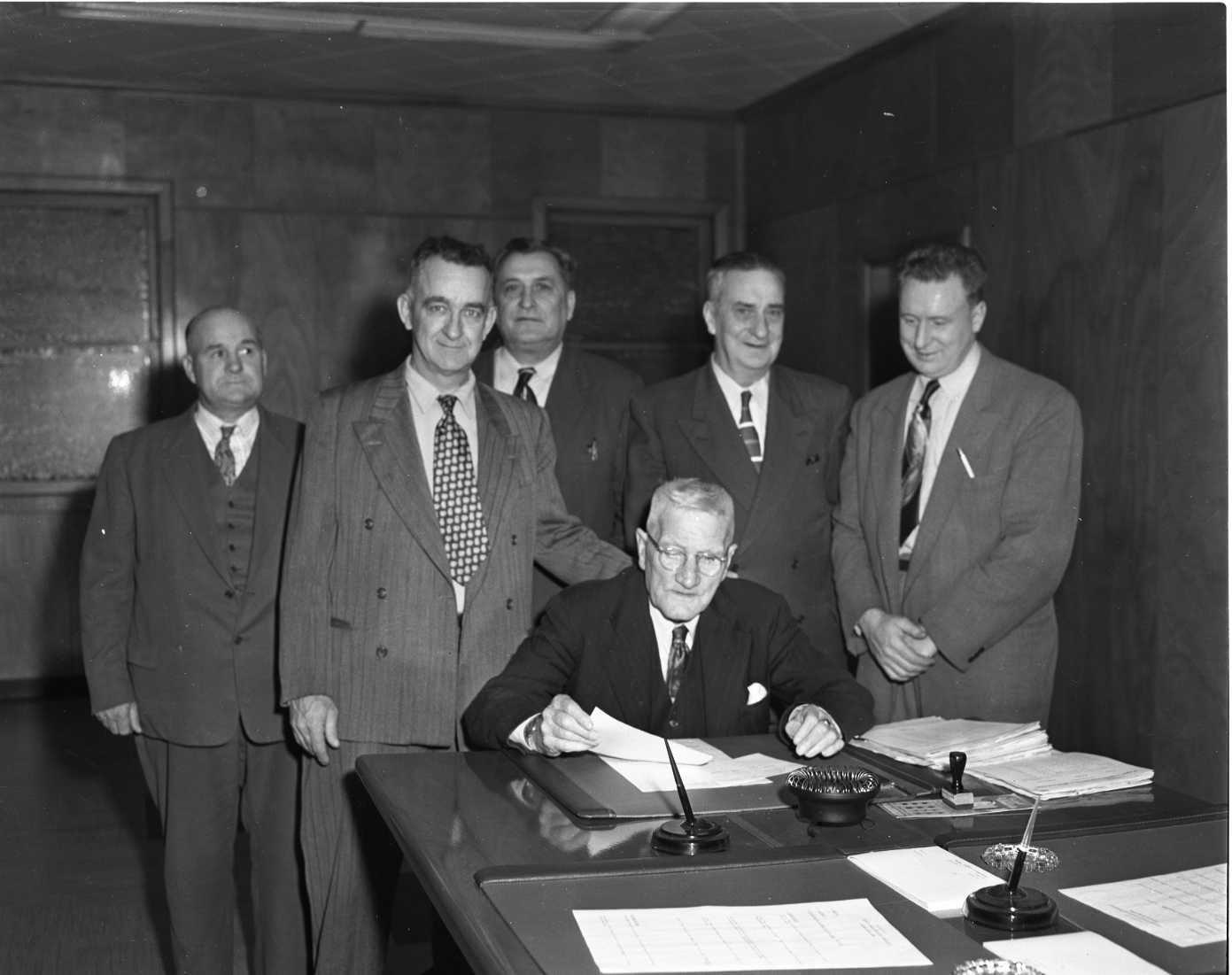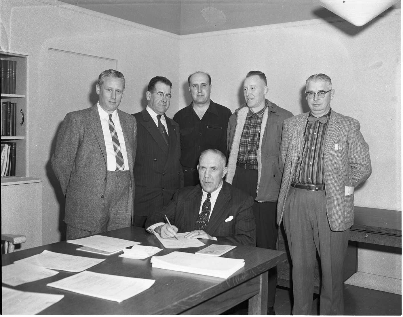 Members of the Midland Public Utilities Commission are seen gathered around their new chairman, David Hurrie, as he took office at the inaugural meeting Tuesday. This was Mr. Hurrie’s 28th year on the commission and the eleventh time he has been chairman. Frank Yon, superintendent, Charles Stephenson, O. H. Smith, Alex MacIntosh, and Stuart Holt, secretary.