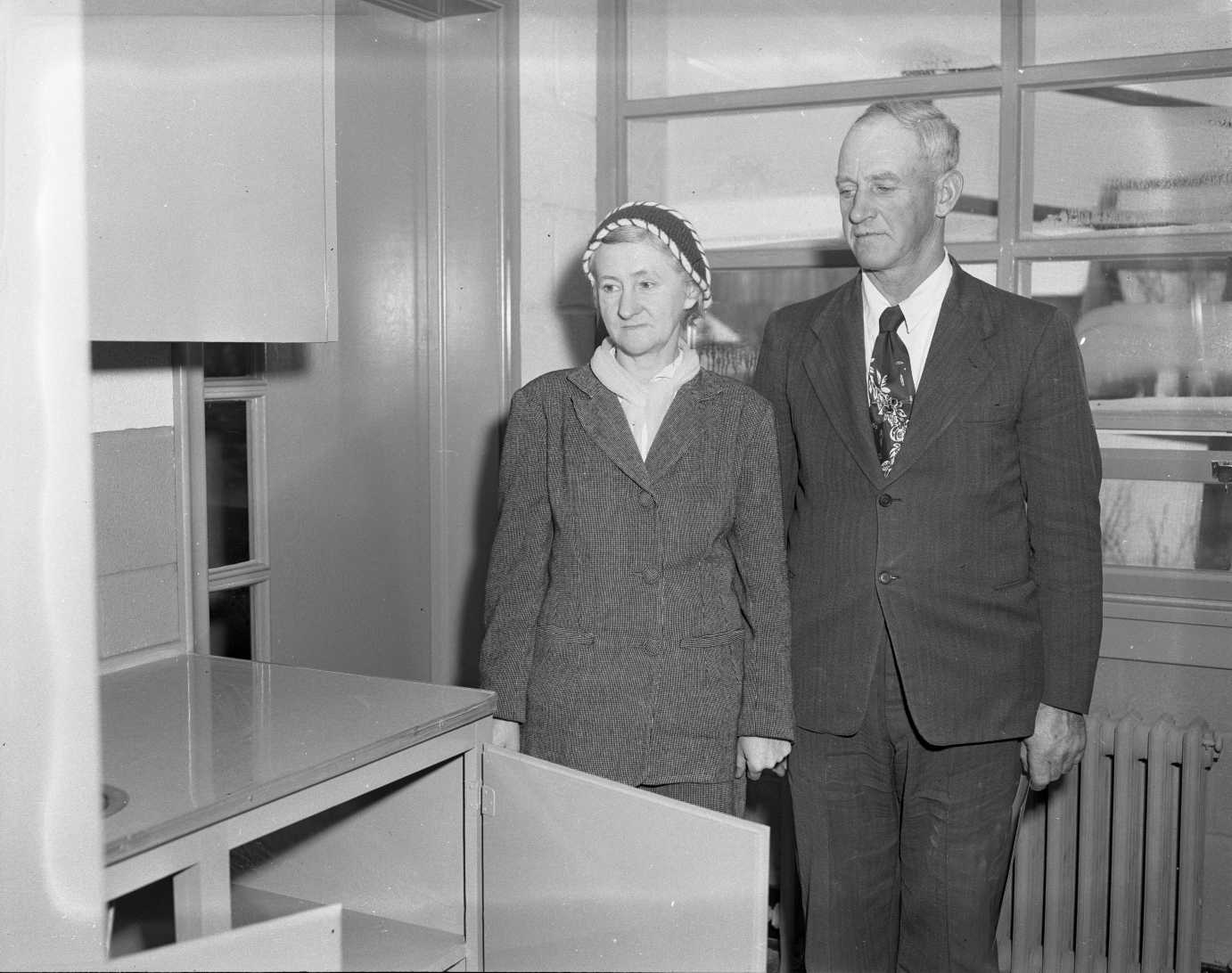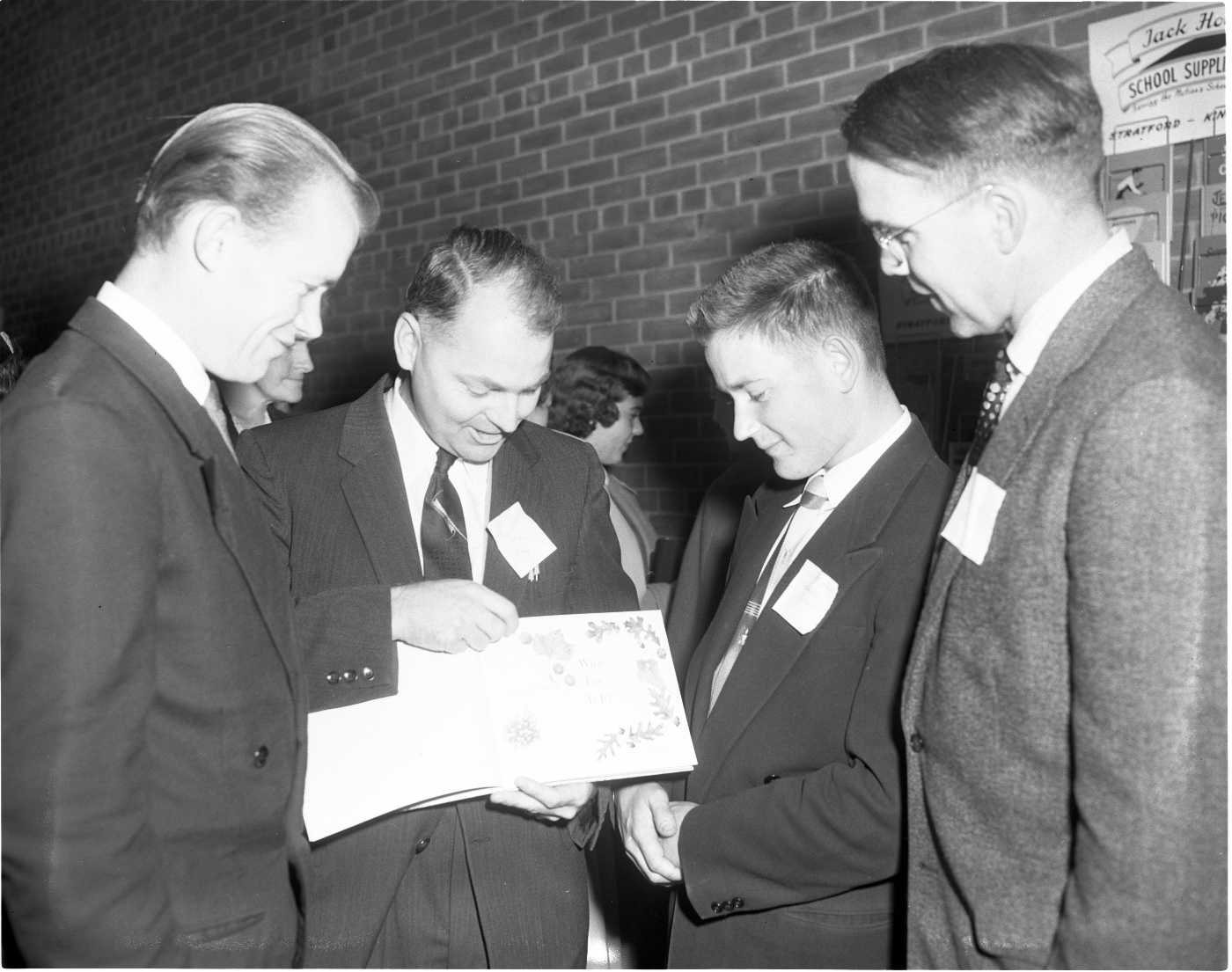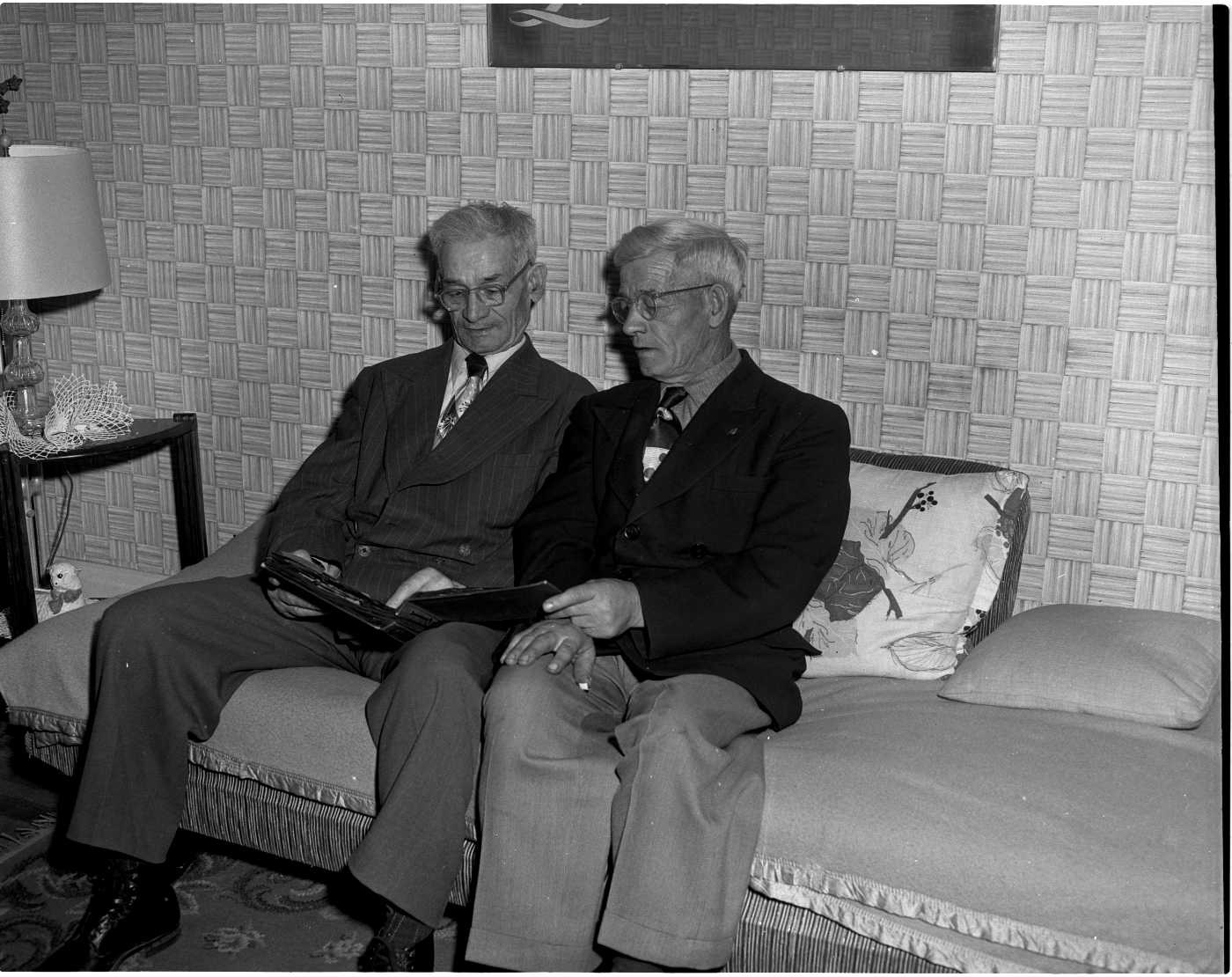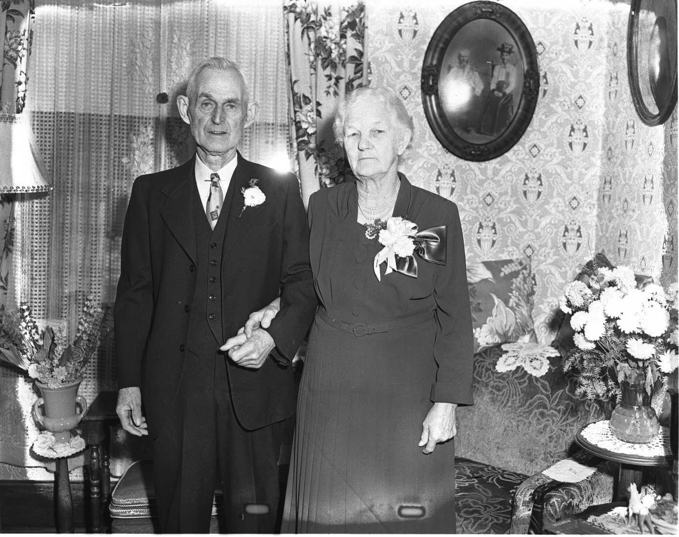 Golden wedding anniversary of Mr. & Mrs. William Wilcox of 403 Nelson Street. They are seen reading congratulations from Prime Minister Louis St. Laurent, Premier Frost, Deputy Speaker Wm. A. Robinson and MPP Lloyd Letherby.
