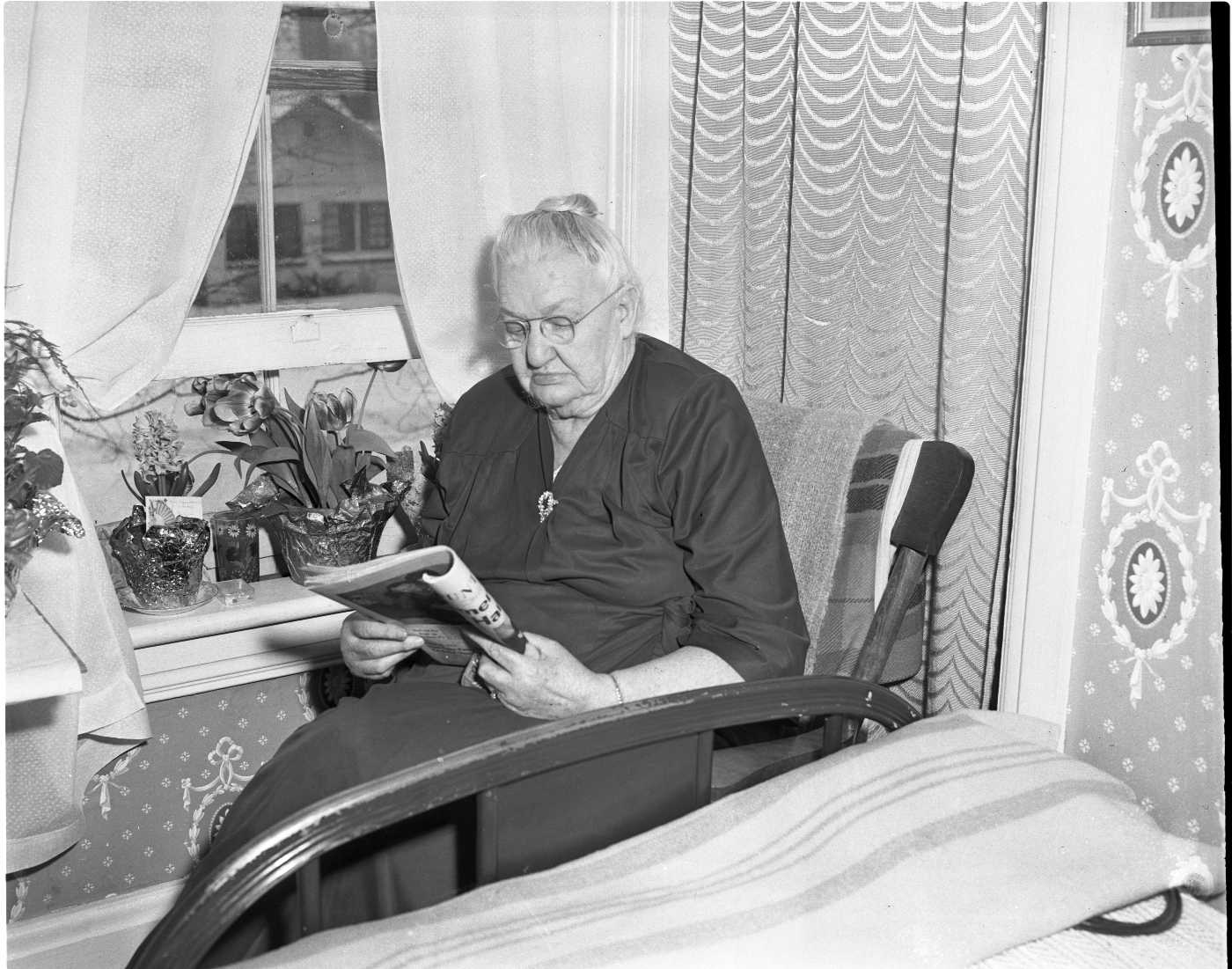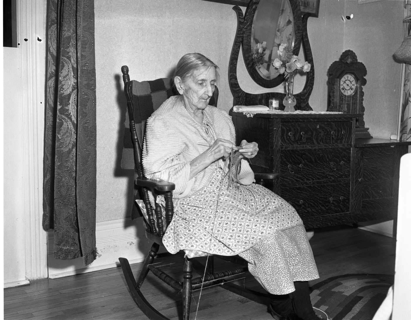 Mrs. John Hare, left, who celebrated her 93rd birthday November 25th, looks at pictures of her two great-great grandchildren with her daughter Mrs. R. J. Wilson of Waubaushene. Born four years before Confederation, Mrs. Hare had lived in Midland for almost 50 years before moving to Coldwater to live with her daughter. Married at 16 to John Hare, 19, the couple moved to Midland where John managed a brick yard, helped build the Aberdeen Elevator and continued to work there for several years, he also served on the Midland Police Force before his death in 1928. Of the thirteen children born to the Hares only three daughters and one son are still living.