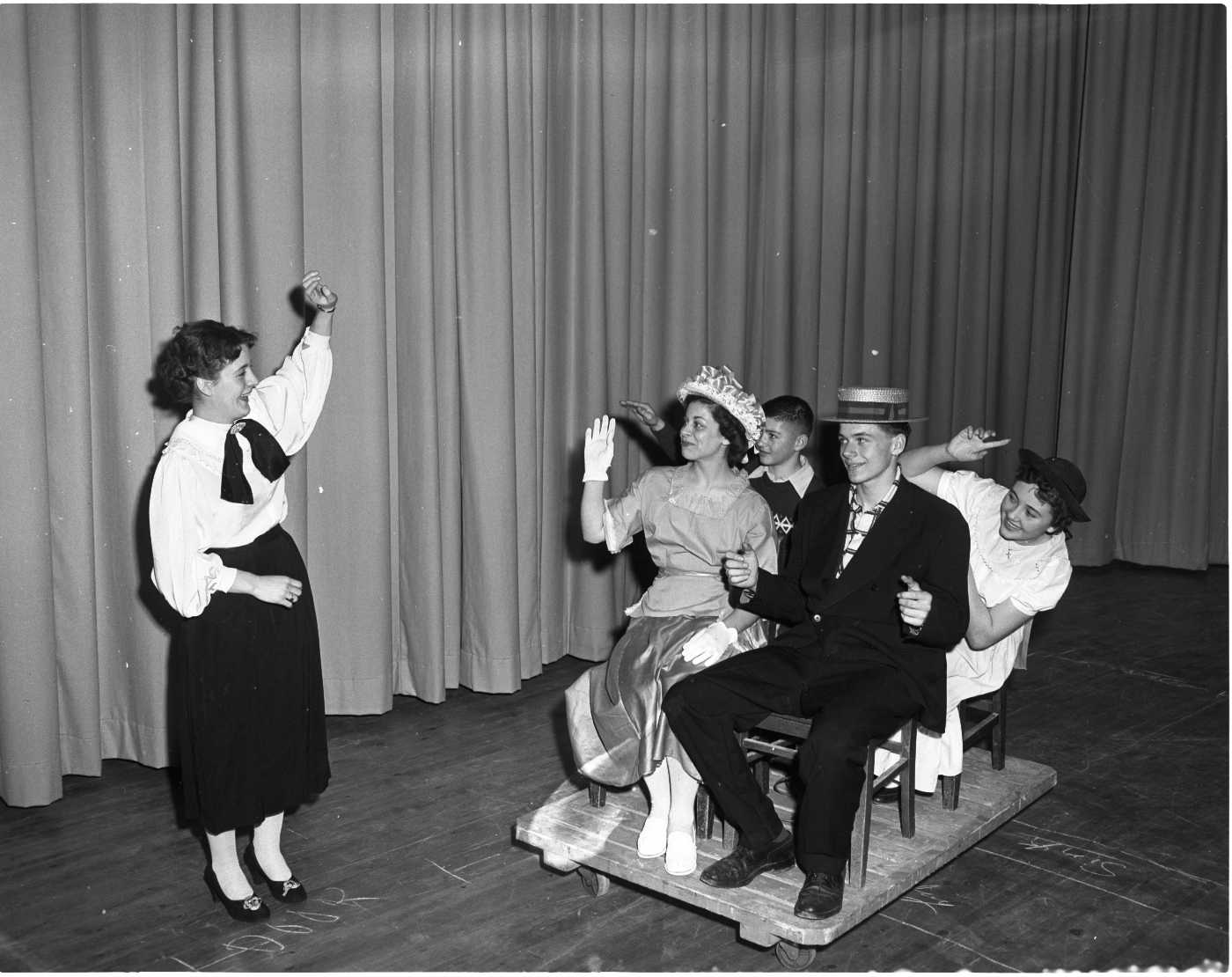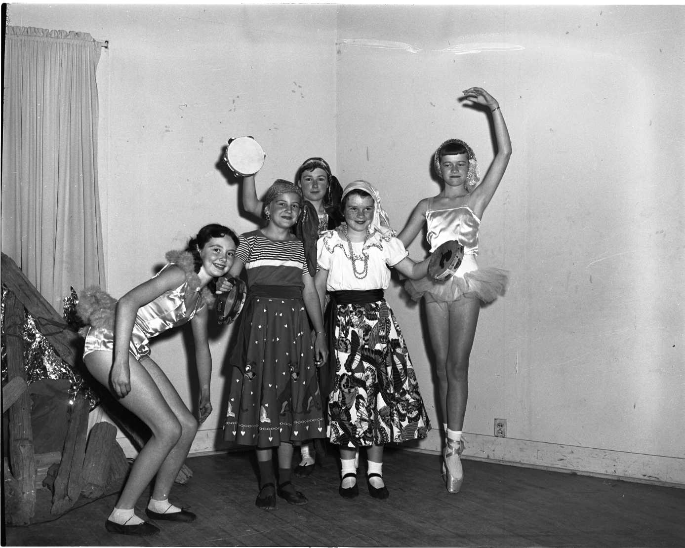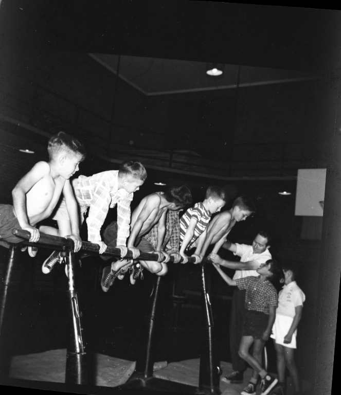 Girls practicing on the pommel horse at the Midland YMCA. Left, Jackie Palmer group leader, Linda Riley on the horse, other girls in the junior gym team are Eden Morrison, Betty Jean Henderson, Peggy Jones and Lynn DeNure. Mrs. Frank Hartman (not shown) is the instructor for the class held every Friday afternoon.