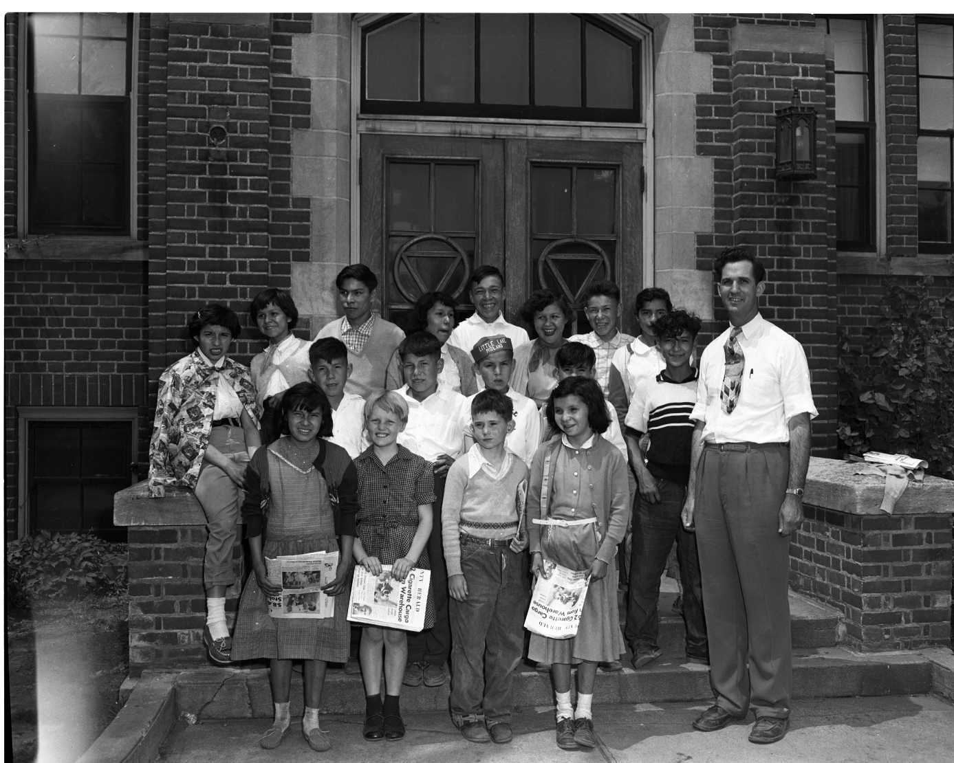 Burned out of house and home just about a year ago these pupils of Crossland Public School now have a brand new building, opened officially by George G. Johnston, MPP, Friday night. About 30 children attend the one room school where Miss Marlene Strath is the teacher. Classes have continued in the nearby community hall, the former Methodist Church.
