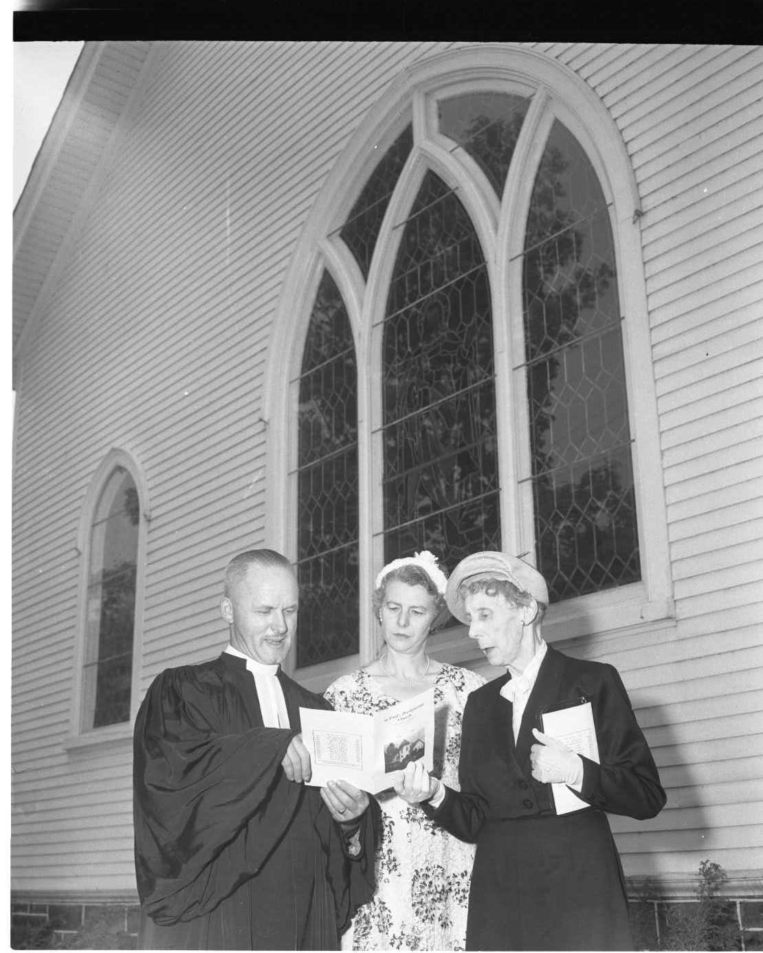 Children of St. Paul’s United Church, Midland, on Sunday combined with the adult congregation for the annual white gift service. Here Brian Gazley, son of Mr. & Mrs. Bruce Gazley, deposits his white gift while Peggy Bray, daughter of Mr. & Mrs. Frank Bray, and Gudrun Mandler, daughter of Dr. & Mrs. Walter Mandler, await their turn. Manger scene was erected by Florence Broad, Gladys Robinson, and R. W. Irwin. Lambs were made about two years ago by the late Mrs. Walter Auld. Yuletide decorations at the King Street entrance were installed by Len Martin, Alex Ayers, Don Edwards, Watson Battrick and Woodrow McConnell.