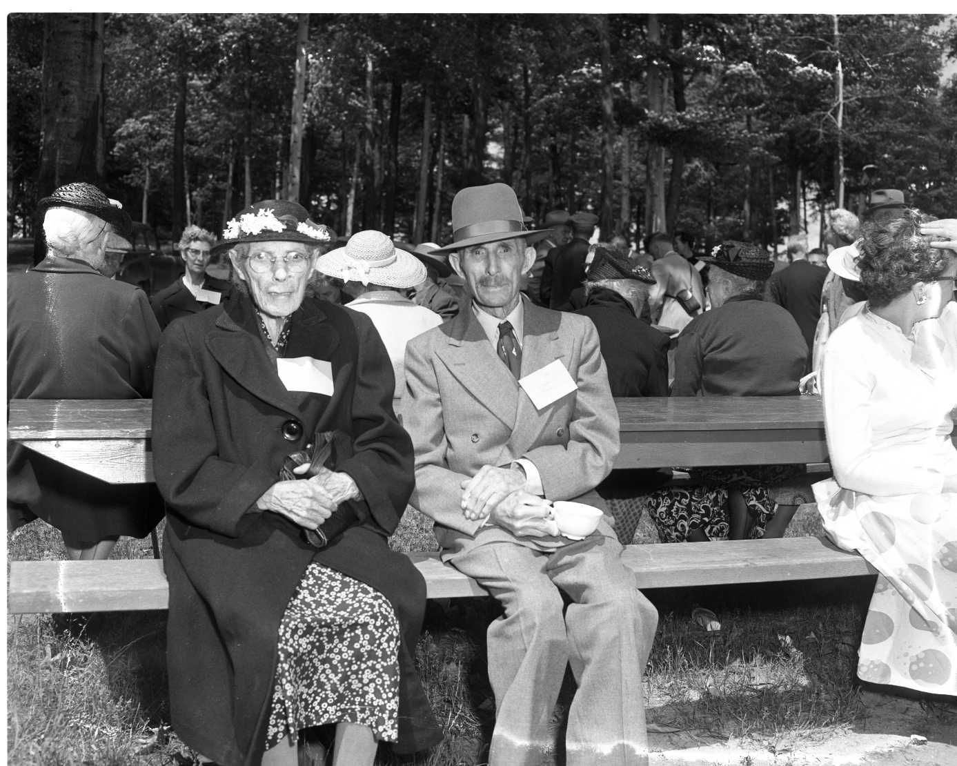 Mr. & Mrs. Charles Hanes of 14 Quebec Street, Midland, celebrate their 55th wedding anniversary January 9th. Charles was born at Egbert, near Camp Borden but moved with his family to Sturgeon Bay as a boy, getting his limited education at Rosemount School. There were about 40 houses and some stores clustered around James Playfair’s mill at that time recalled Charles. He worked for 35 years for various farmers in the summer and in the logging camps around Georgian Bay in the winter. Top wages farming were $20 per month with board and $26 per month in the bush. In 1915 they moved to Midland and Charles worked in the various sawmills then spent 14 years with the Benson and Bray planing mill. His next work was with the shipyard in the blacksmith shop and for the past nine years he has worked for the Midland Park Commission. Mrs. Hanes, the former Mary Potter, daughter of Jeremiah Potter, was born near Vasey and also grew up near Sturgeon Bay. Her first memory of Charles was being chased by him and a group of his friends near the swimming hole at Rosemount. Of their three sons and two daughters only Garnet lived in the Midland area.