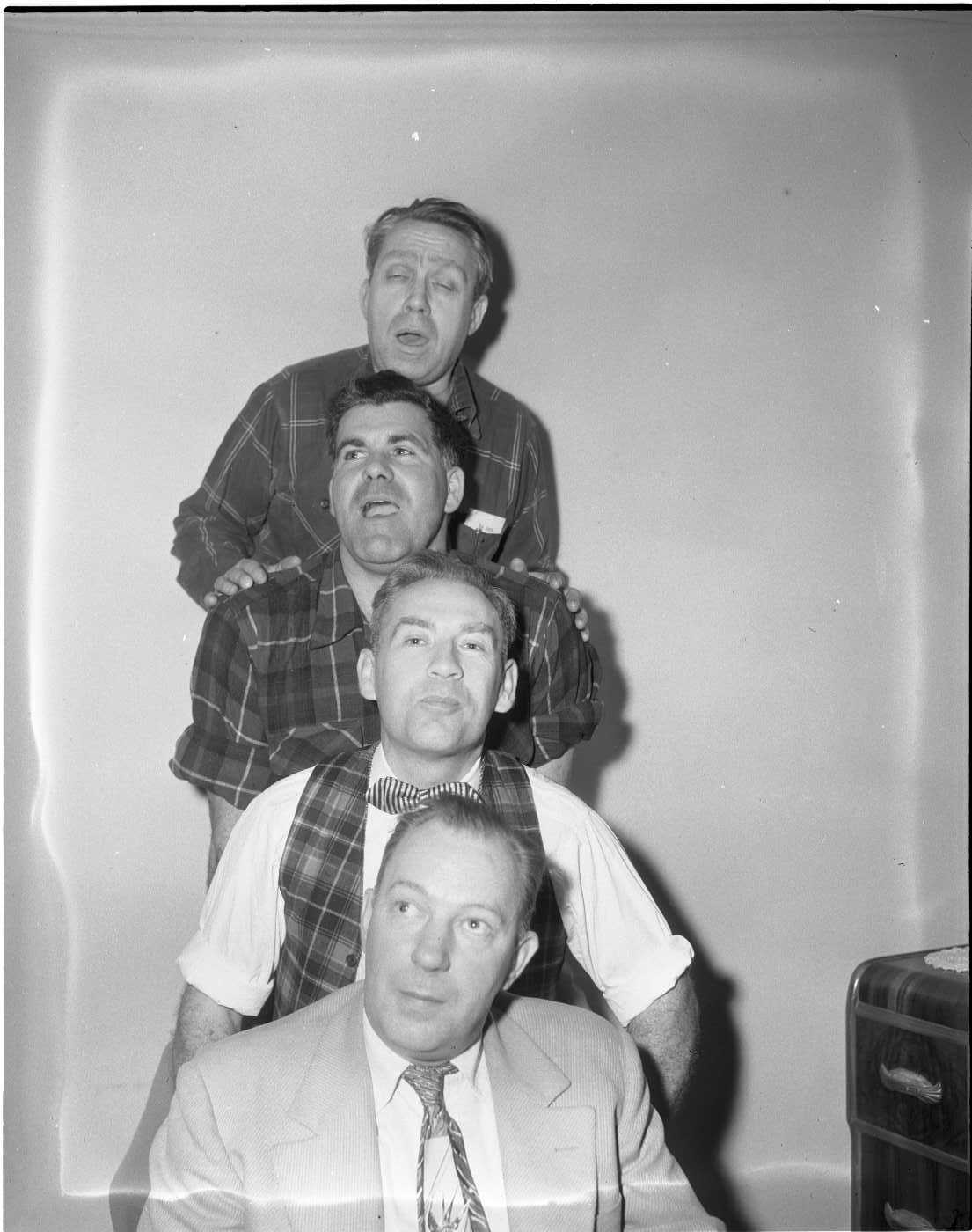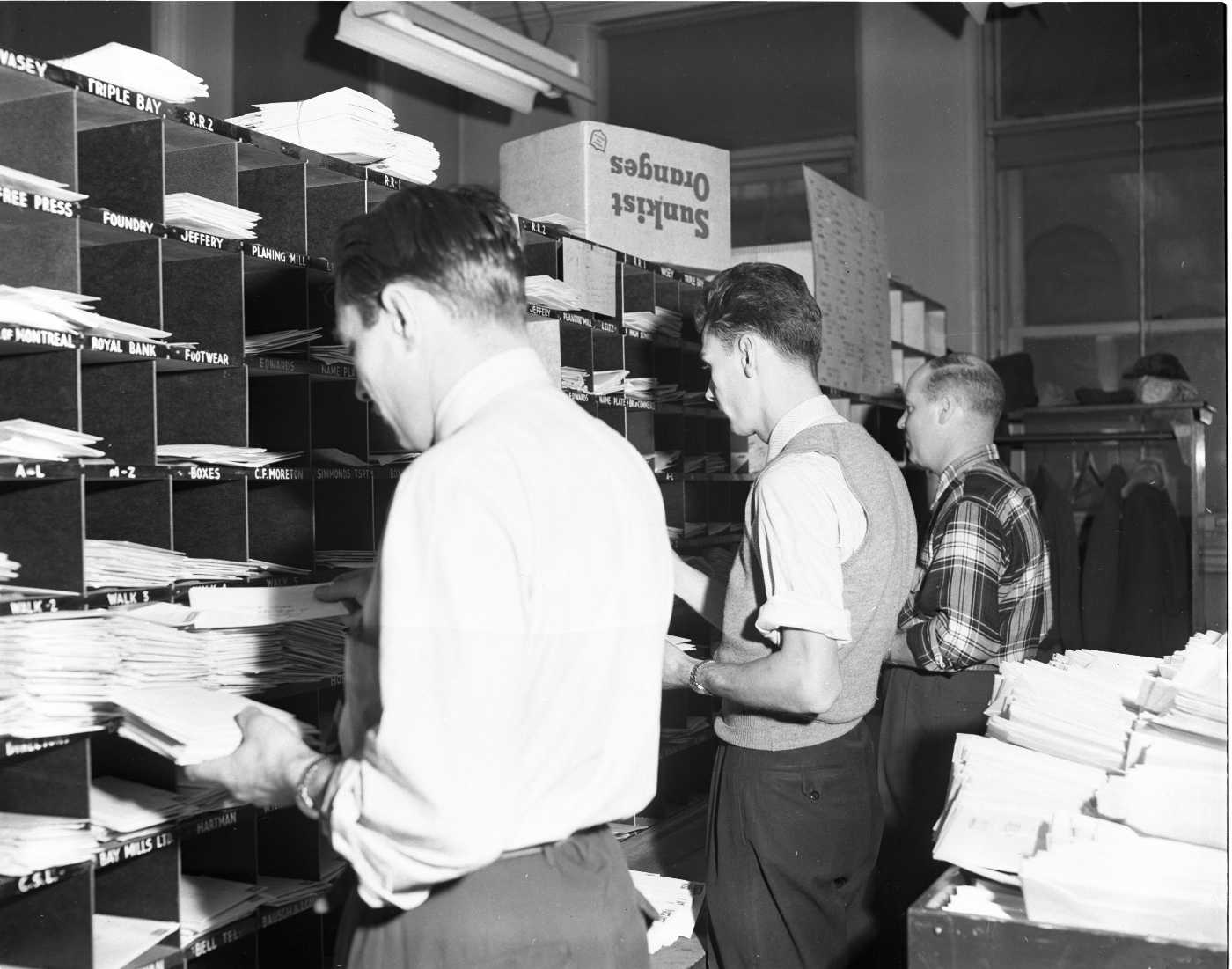Amid a sea of cards, staff at the Midland Post Office had a busy time this week. Al Hennin, Clarence Dingman, R. White and postmaster W. F. Bourrie. (The employee on the right was cropped out of the photo in the newspaper.)