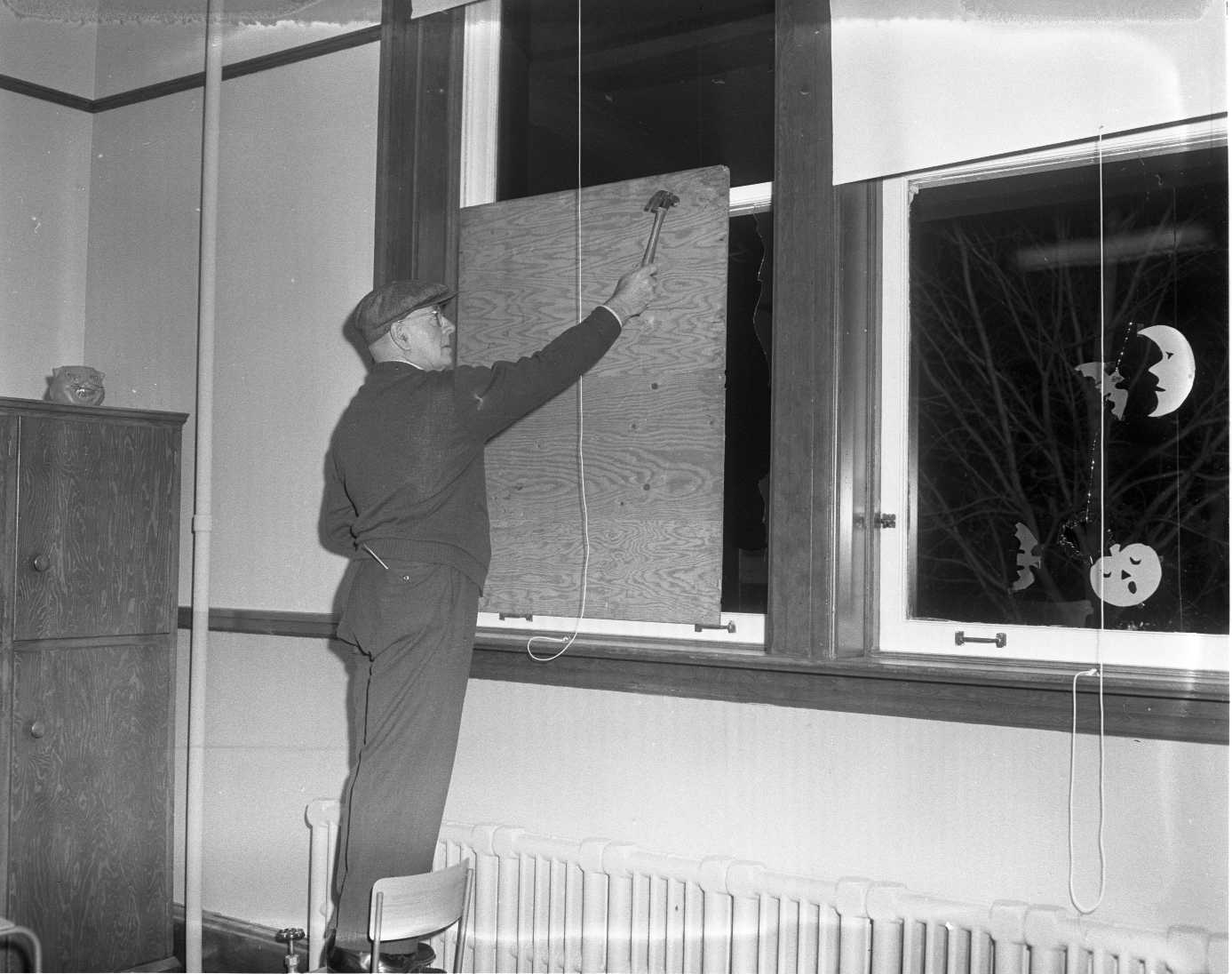 A rush job converting the MHS facility for public school use over the Christmas holiday, carpenter Ken Trew is seen boring holes for ink wells in 40 grade eight desks as well as other jobs throughout the school.