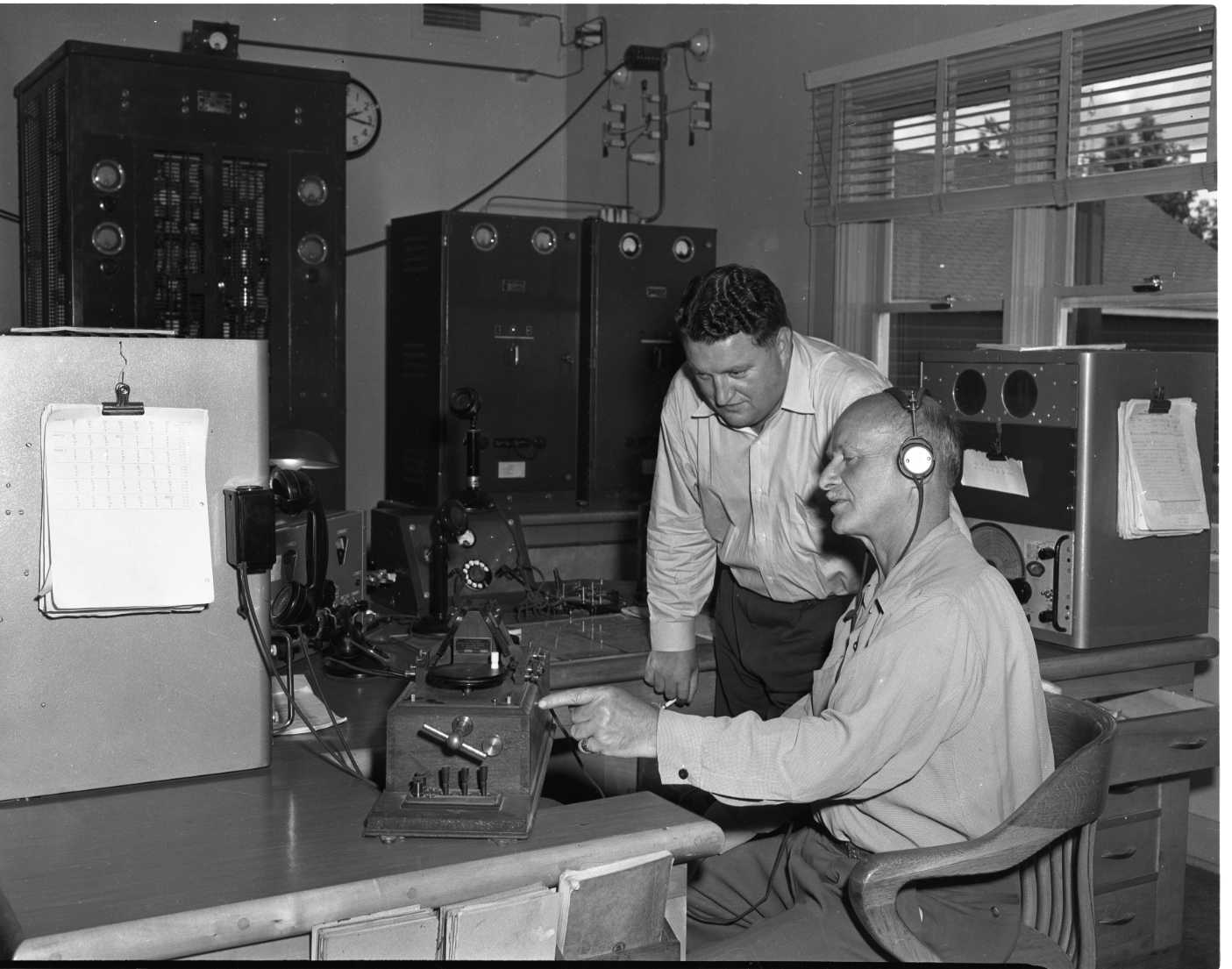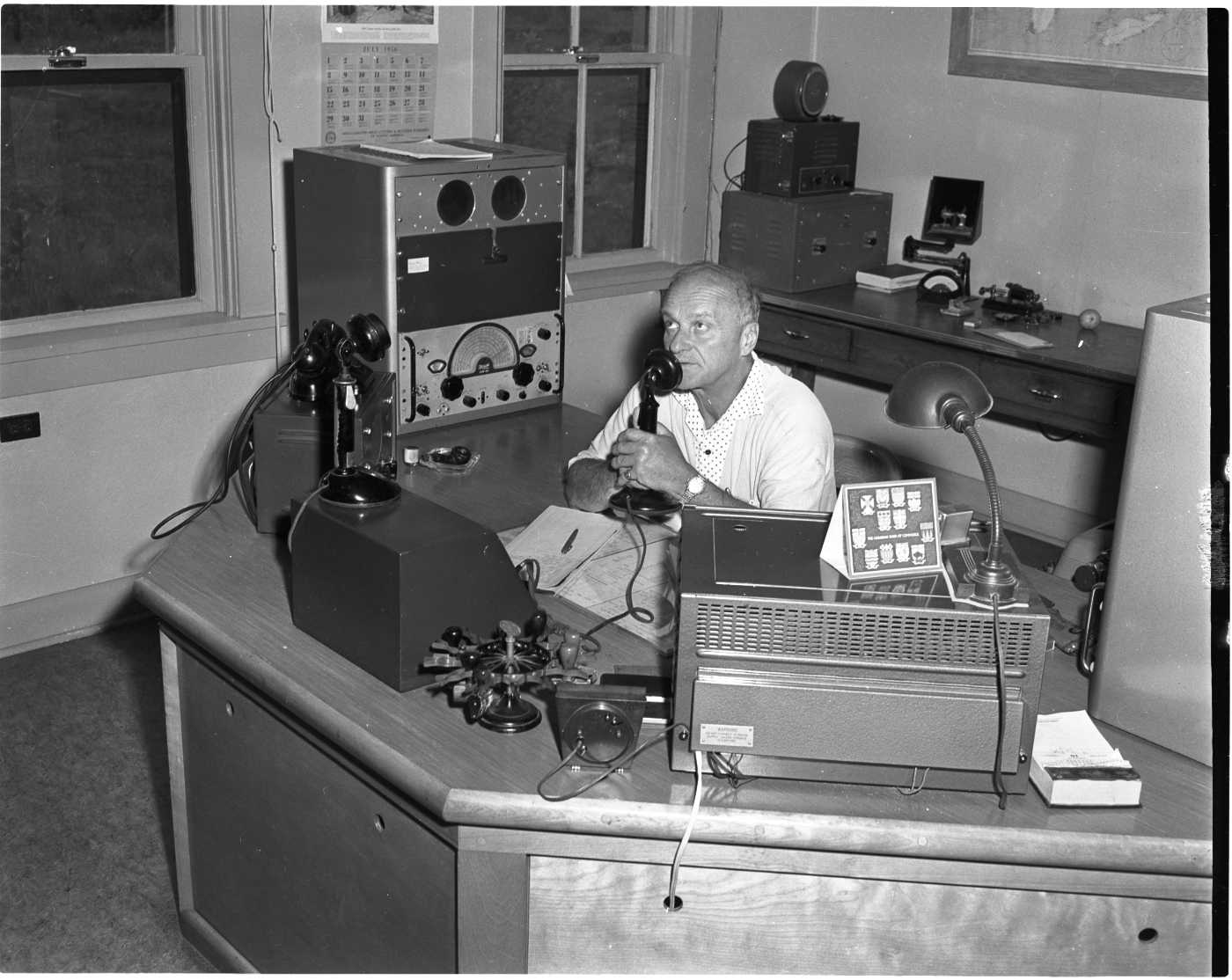 Not too many years ago, when Anthony Blouin was learning the trade, contact to ships from shore was by Morse key or primitive wireless transmission. Now Mr. Blouin can pick up the phone and talk to almost any ship on Georgian Bay, as far away as the Soo. Telephone connection between the ship and its headquarters in Toronto, Montreal or elsewhere is also made through the Midland Marconi station.