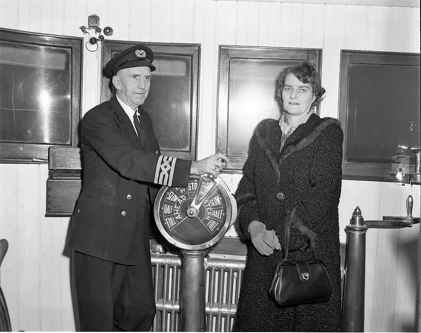 Captain Joseph Stewart and his wife in the wheelhouse of the Assinaboia on the occasion of his last trip of the season and of his 36 year career with CPR steamships and 50 years of sailing.