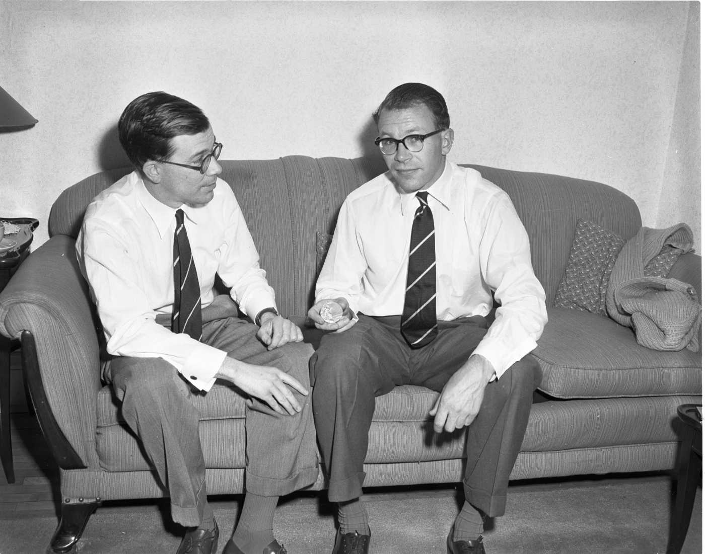 Chris Brasher of London England is showing local doctor and twin brother Peter Brasher the gold medal he received in the 3,000 meter steeplechase at the Melbourne Olympics last month.