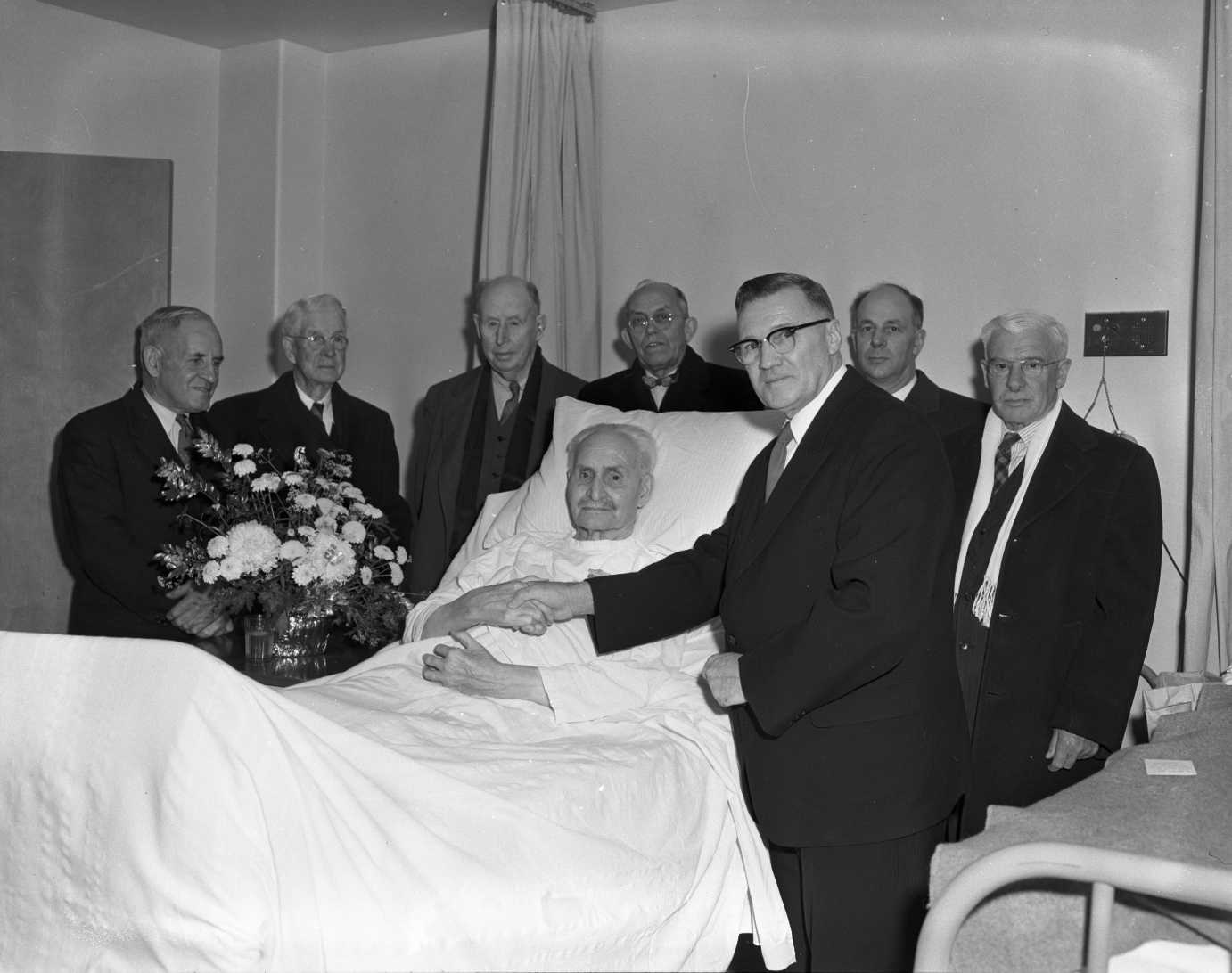 Half century of membership in Midland’s Caledonian Lodge, A. F. and A. M. was the reason for this happy gathering at St. Andrew’s Hospital last Sunday. J. J. Robins presented a veteran’s jubilee metal (50 year jewel) to R. G. Nesbitt, who at 94 is still able to smile his appreciation. Left to right, Gilmour Nesbitt, J. W. Bald, Capt. Ed Burke, Charles Flowers, Sidney Thompson and R. S. King.