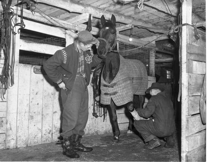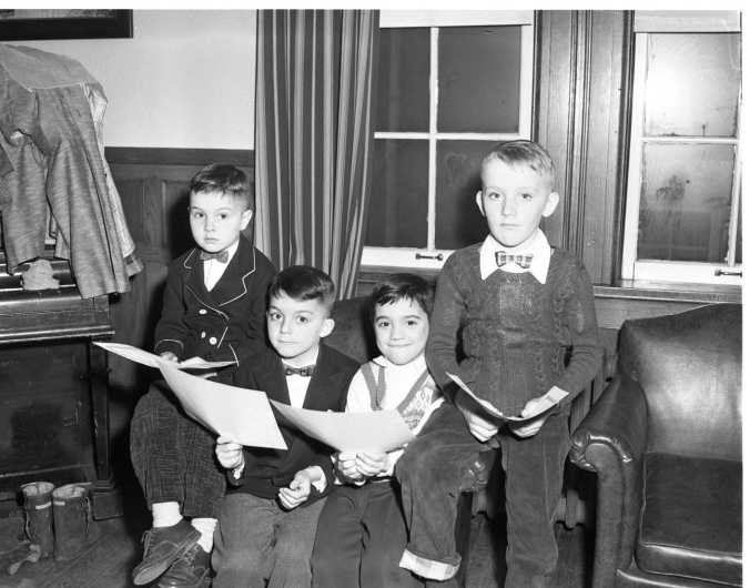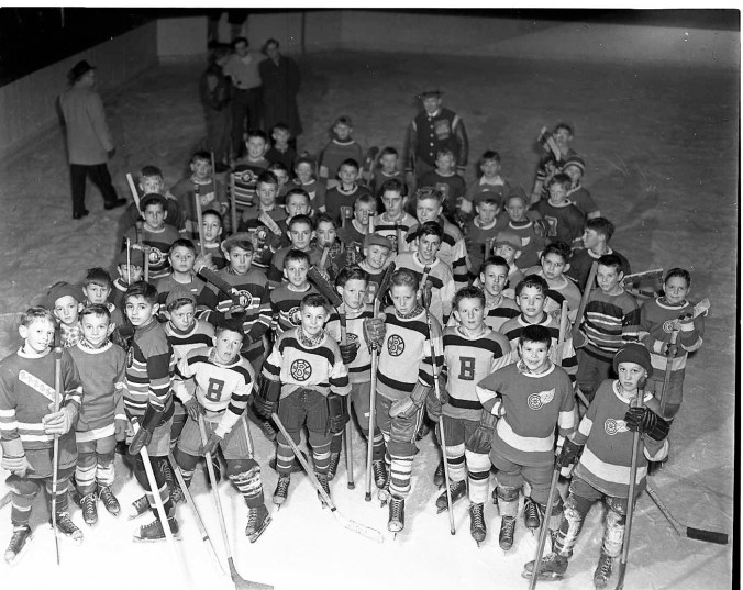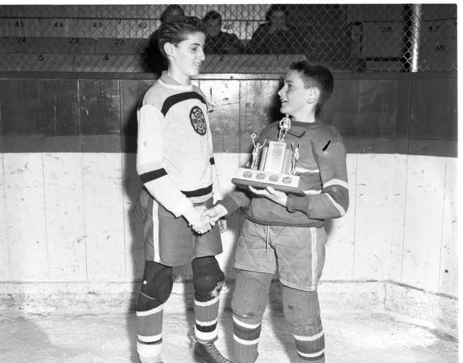 Three Midland Orphans hockey team players, Morley Spiker has Peterborough Petes jersey, Pit Legault has number 14, the third is Harry Morrison. Coach not pictured is Ed Bolan. December 11th, 1953.
