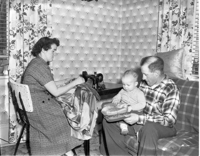 Red, white and blue is the colour scheme of children’s playground equipment at Midland Drive-in Theatre this year. Two painters are shown putting finishing touches to swings in the background, while two little girls amuse themselves in the sandbox centre foreground. The drive-in, which opened on the weekend, was undergoing general spring face lifting operations when this photo was taken.