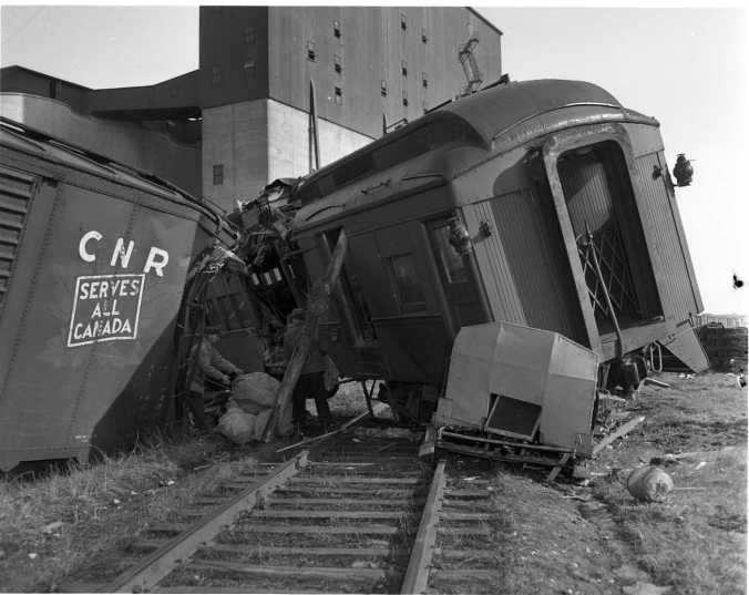 A heap of wreckage being towed behind a wrecking truck was all that was left of a heavy truck after it had been struck by an outbound CNR passenger train on the William Street level crossing. Climbing out of the coal yard in low gear in a heavy rain storm the driver did not see the train coming. The driver of the vehicle escaped with only a severe shaking up.