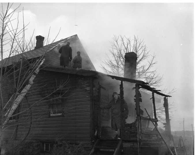 This farm house was threatened by a fire that started in an adjacent garage on the property of Cecil F. Woods at Lot 10 concession 4 Tiny Twp. (not Cecil Wood the Tiny Councillor). Neighbours formed a bucket brigade and the Midland Fire Department arrived and finished the job. Lost were a tractor, feed chopper, tools, syrup pails and other equipment.