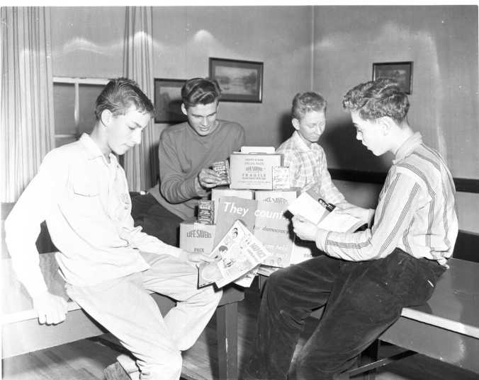 Some youngster, or youngsters, in this area, will get financial assistance for a holiday at Kitchikewana YMCA Camp this summer, through the efforts of the Adelphi Hi-Y Club of Midland YMCA. Several club members toured Midland homes Wednesday in quest of baskets, bottles and coat hangers, proceeds from the sale of which will be used to send a lad to camp. Sorting out the pile of bottles and coat hangers are Bev Day, left, and Wayne Morrisson.
