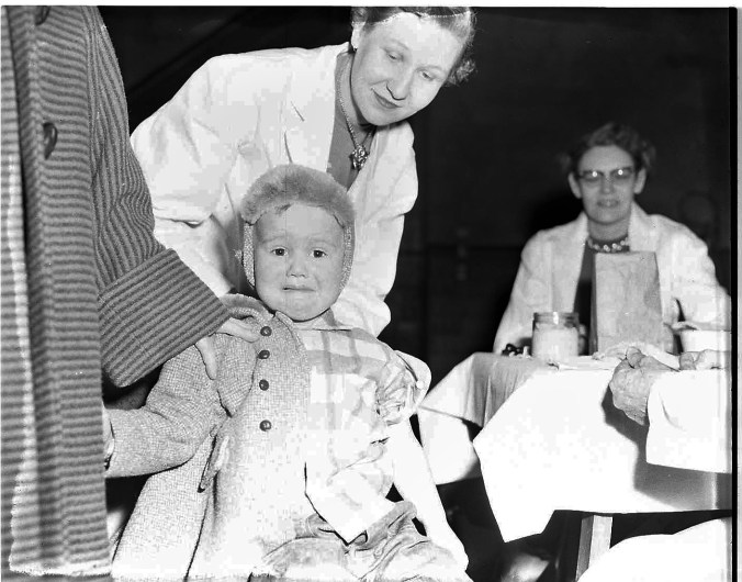 - Immediately following the Easter recess, Simcoe County Health Unit will start to vaccinate more than 8,000 elementary school children throughout the county. According to the program released by director Dr. P. A. Scott, children who received two doses of Salk polio vaccine in 1955 and did not receive the third dose in 1956, will receive a third dose this year.