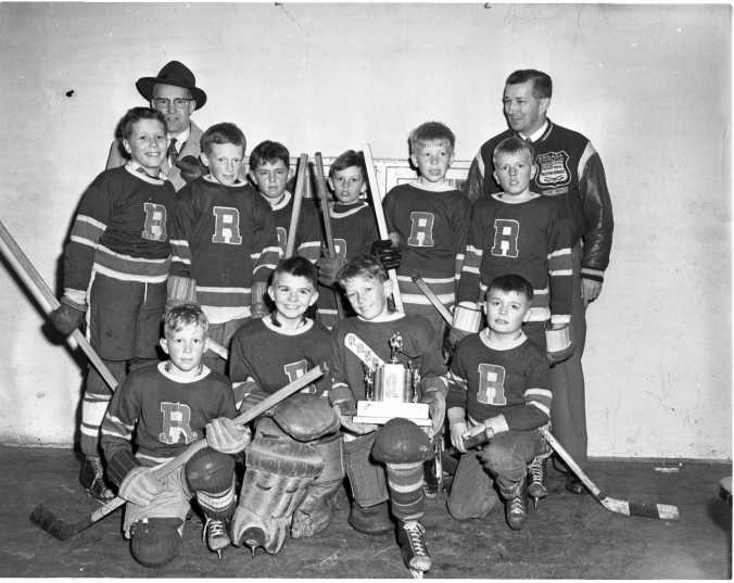 Bulging with chicken and banana cream pie, members of the K-W Dutchmen, Legion Branch 80’s entry in the senior OHA division of Midland’s Little NHL, posed for the County Herald camera following a dinner in their honour at Bourgeois’ dining room Tuesday night. The boys are wearing snappy new sweater coats donated by the Legion branch. Also in the picture are Legionnaires Graydon Rodgers, Don Gallivan and President Charlie Scott, along with coach Morley Spiker. March 28, 1958