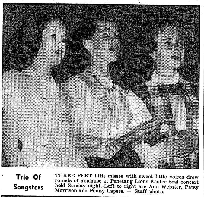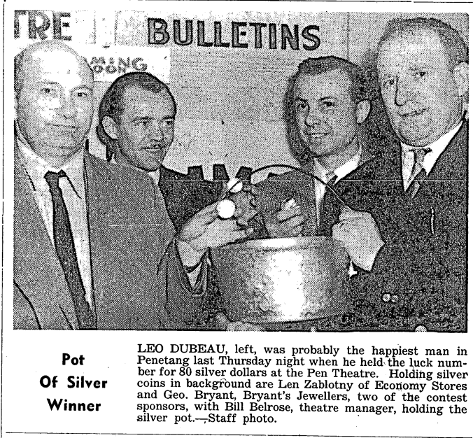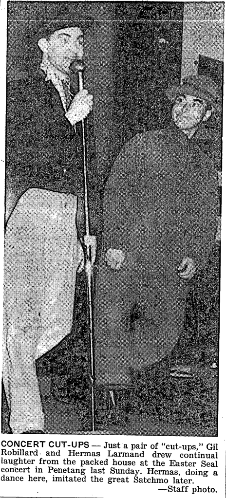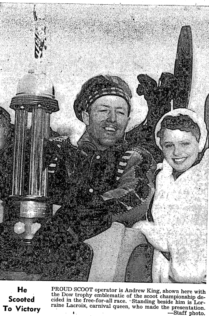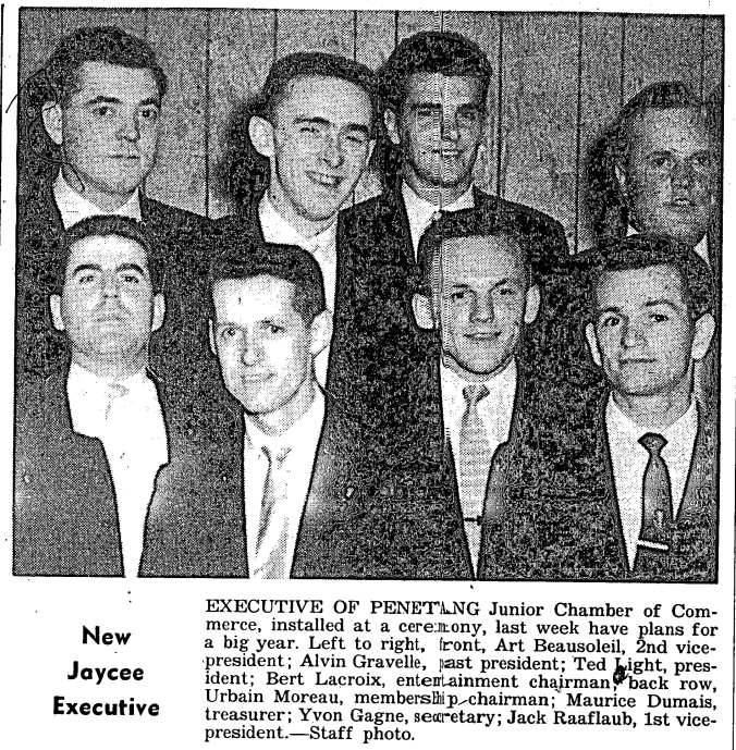 True to form, Midlander Joe Leeking makes it out to vote on June 10th from his hospital bed at St. Andrews with the help of nurses Ann Desroches and Betty Perry and some crutches. Joe was seriously injured in a car accident on April 23. (My parents and maybe everyone called him “leaky Joe” because he operated a mobile public address service which consisted of large horn shaped loud speakers on top of his car. I remember him driving up our street announcing events and he was a fixture at the Midland Indians ball games doing the play by play.)