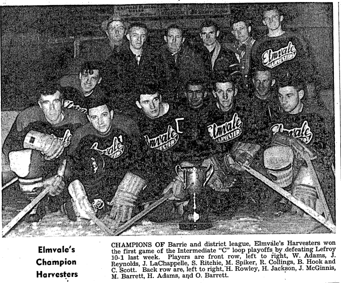 Can they repeat again this year? That question will be answered in Collingwood today and tomorrow as these youngsters battle to retain the provincial championship they won in the LHL Junior OHA series at Parry Sound last spring. Kneeling; Bobby Clayton, Earl Scott, Tom Gray, Doug French. Second row; Greg Somers, Jim Tippin, Allan Mostyn, Jon Pettersen, Chester Graham, Bob Weckman, Keith Bath. Back row; Bill Brooks, Wayne Holden, John Swan, Don Pringle, Dave Brooks, Doug Taylor, Dennis Abbott, Randy Small, Rev. Len Self.