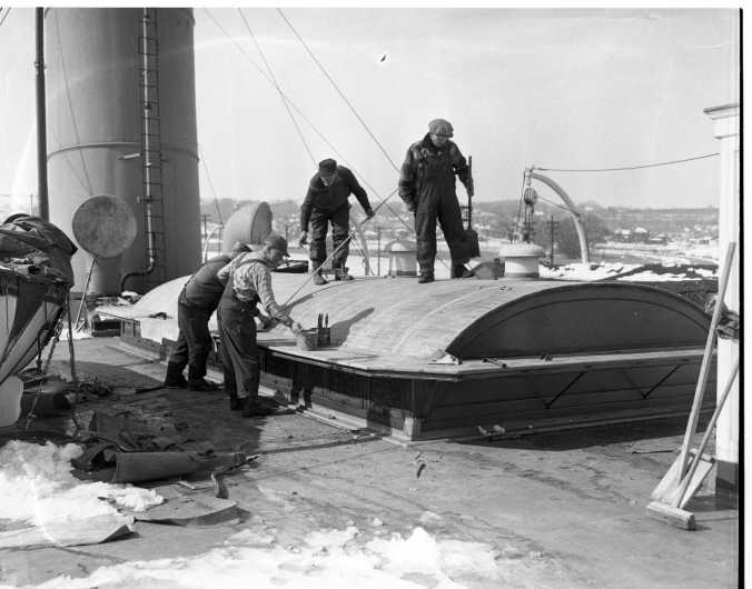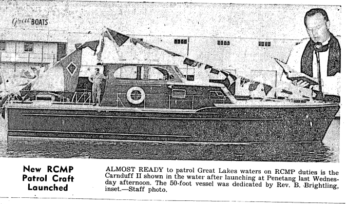 Forty foot cruiser the “Sea Flight”, owned by Toronto industrialist Robbert Hartog of Kitchen Industries Limited, and Paterson freighter Quedoc collide at about 10:50 PM two miles north of Hope Island. Mr. Hartog was outbound for Little Current with five Scouting youth and another leader while the Quedoc was inbound loaded with grain for Midland. One third of the stern was sheared off but there were no injuries. Passengers were picked up and the cruiser towed to Midland by the Quedoc. These photos are taken at the Great Lake Boat and Machine yards in Sunnyside.