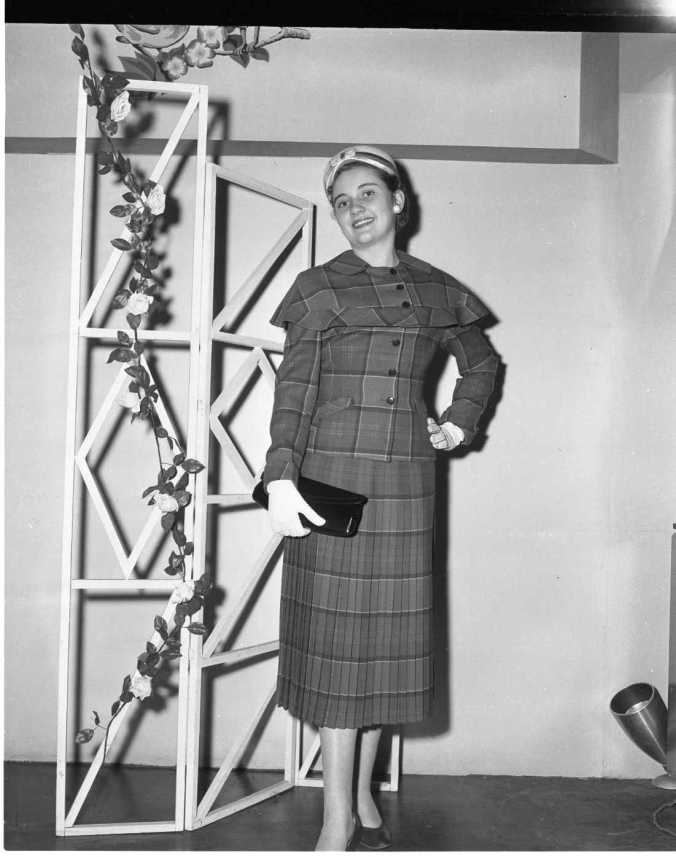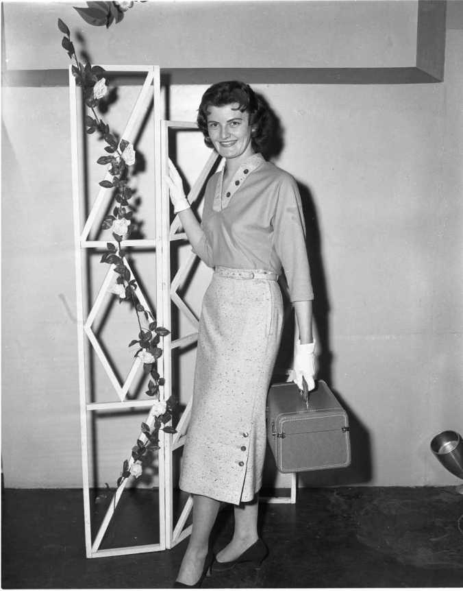 Photo from Edward’s Specialty Shoppe spring fashion supplement to the County Herald April 1957, the model is Mary Arbour. “This beige and black jacket dress was worn by Mary Arbour for the recent Edward’s fashion show created a great deal of interest. The jacket buttons up the back and the sheath dress features a cross over neckline.”
