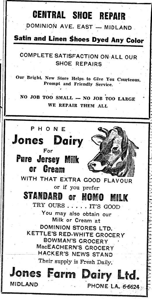 A leading businessman in Midland for 33 years and mayor for 3 years, J. S. McDowell of Manly Street observed his 80th birthday March 27th. Mr. McDowell was born on a farm at what is now Ebenezer in 1877. It was his father, the late Thomas McDowell, who donated the land on which the old Ebenezer Methodist Church was built. John is the last surviving member of that family. The old farm has since been the home of several generations of Fagans. Mr. McDowell received his early education at Ebenezer and then attended business college in Owen Sound. Coming to Midland in 1906, he became a partner in the Big Four stores. His associates were Silas Milligan, James Stafford, and W. W. Sneath. Mr. Sneath is still living and resides in Toronto. The “Big Four” operated three stores in the buildings now occupied by Livingston’s, Diana Restaurant and the Singer Company. They sold everything from meat to general furnishings. In 1906, Mr. McDowell bought out one of the stores (the one now operated by Livingston’s) where he ran a men’s furnishing store until ill health forced him to sell out in 1929. In 1933 he moved to Bradford where he operated another general store until 1940. Back in 1908, Mr. McDowell had married the former Katherine (Kate) Piggott. Mr. McDowell first entered municipal politics as a Midland alderman in 1915. He moved steadily up the ladder and was deputy-reeve in 1916, reeve in 1917, and mayor the next three years. “They were good years. Midland was a real good business town in those days, with the shipyard, smelter and the lumber mills still running,” said the former mayor. He also served on the library and school boards at other times. - County Herald, Friday, April 5th – Headline- “Ten Orr Lake Cottages Entered – Police Charge Three Toronto Boys” A routine investigation by OPP Const. Ray Wilkinson of Elmvale last week resulted in finding two young girls missing from Toronto for 10 days, and charges of breaking, entry, and theft against the three Toronto youths found with them in an Orr Lake cottage.