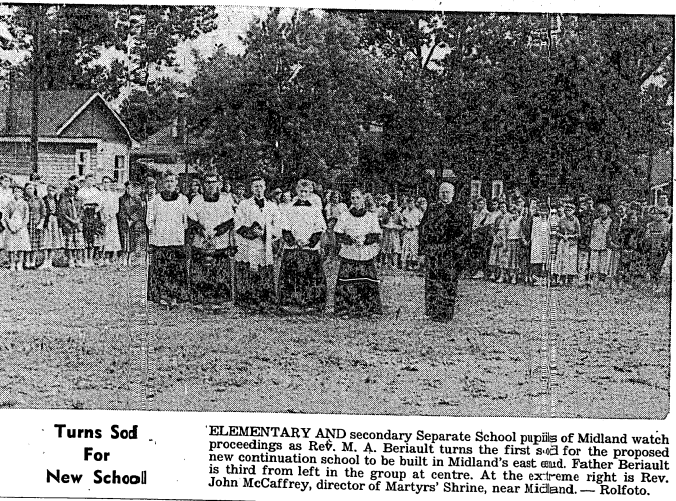 - Work has begun on a new three-classroom continuation school for the parish of St. Margaret’s, on property at George Street and Dominion Avenue, Midland. It is hoped the one-storey frame structure will be ready for occupancy in September. The school will accommodate Grade 9 and 10 pupils, with the possibility of other grades later. Rev. M. A. Beriault said yesterday. Grade 9 and 10 pupils were formerly housed in two upstairs rooms in Sacred Heart School.