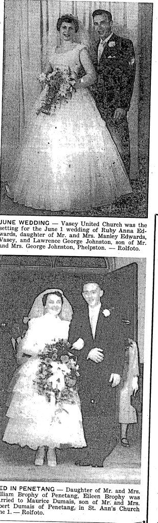 Back in 1909 two brothers from Vasey married two sisters from Omemee. One-half of that combination is pictured, Mr. & Mrs. Louis Jones farmed just west of Port McNicoll on Highway 12 and still live there. Mrs. Jones’ sister Minnie died a few years ago and her husband James Jones lives with his daughter Mrs. Delbert Reynolds at Wyevale.