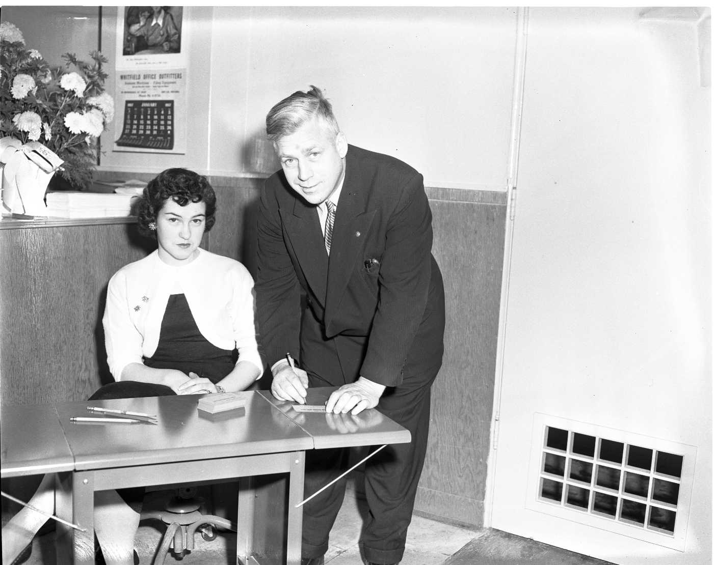 Applying a plaster base coat to the walls of one of the bright, airy offices in Midland’s new municipal building are Monty Lalonde, left, and Ray Boucher. Both are employed by Lloyd Murday, the Midland general contractor. Non-arrival of steel frames for some of the huge windows has caused considerable delay in the progress of the building. Both men went on to establish their own businesses and were considered locally, the best in their profession.