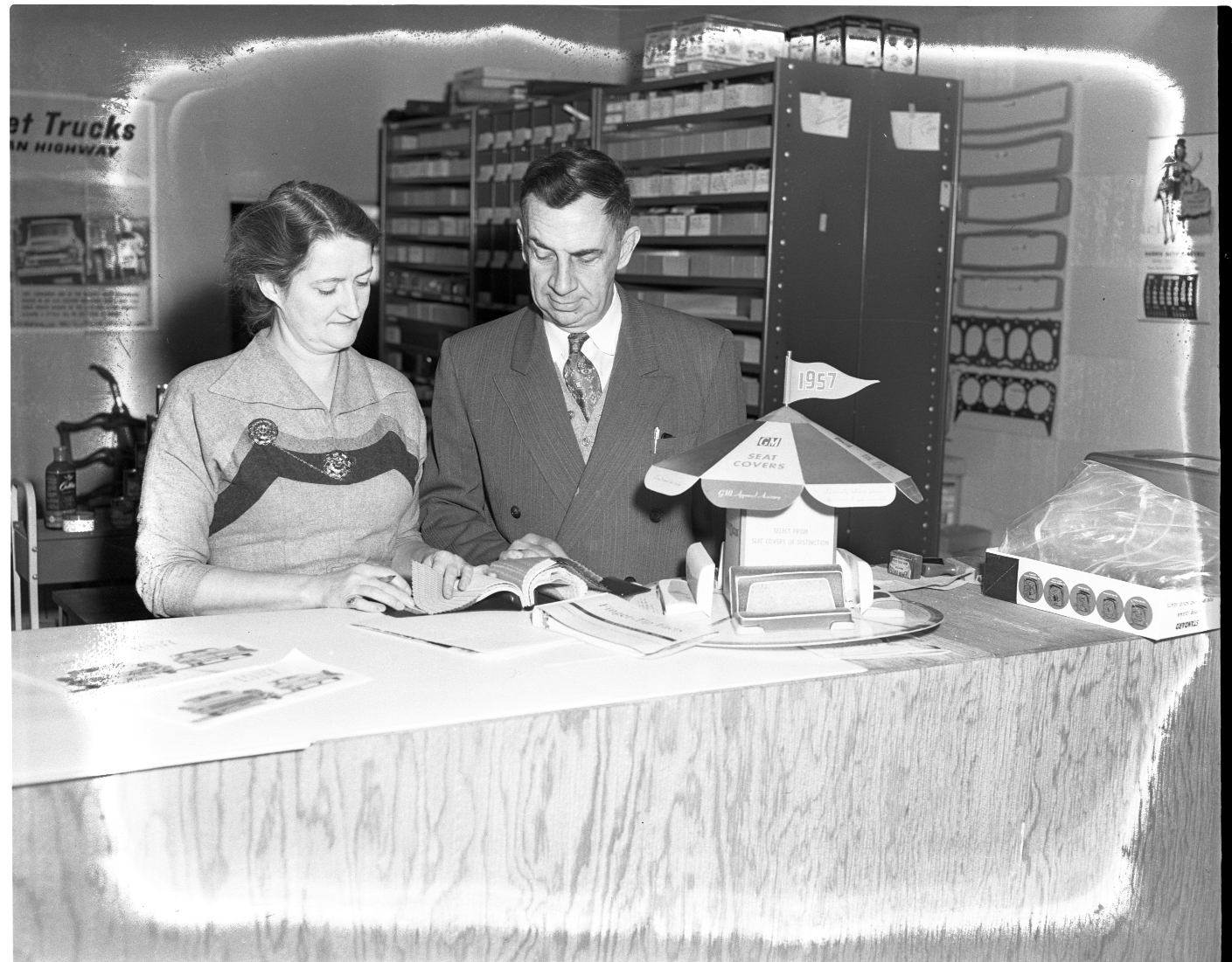 In the service station business in Midland for the past 20 years, Frank Wilford, left, sold his business last week to Henry Laurin. Mr. Laurin also operates the Midland – Penetang ambulance service. After a few weeks holidays, Mr. Wilford expects to enter a new field of business in Midland.
