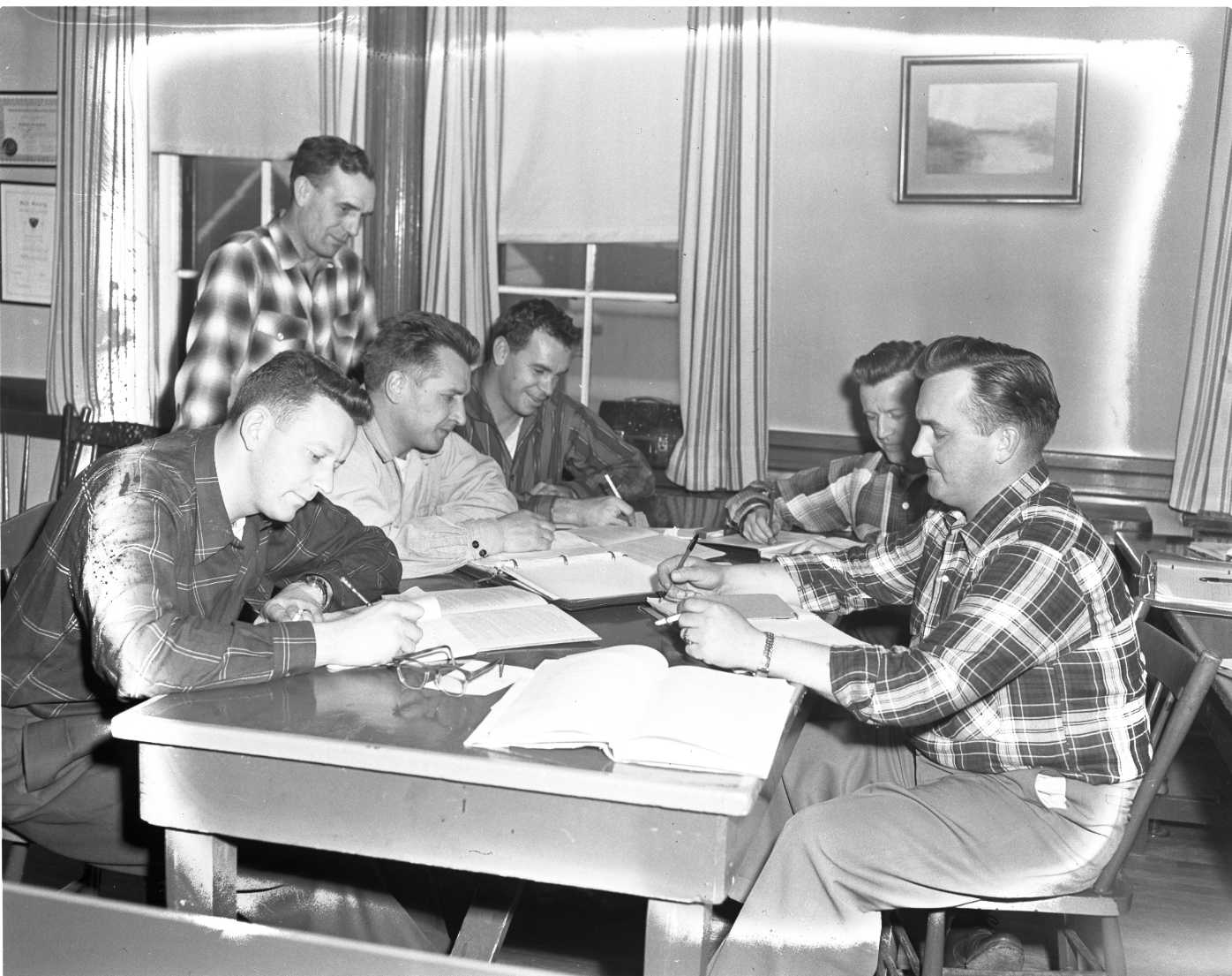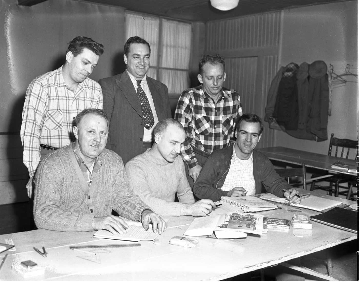 Baseball is in the air in Midland again, first organizational meeting held at the YMCA Thursday. Larry Greene, Buzz Deschamp, Joe Faragher, Jack Hendrickson, Murray Yorke, John Power and Harold Jackson.