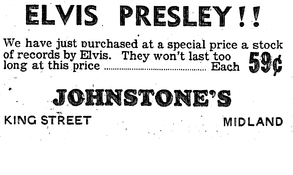 - Midland was spared a minor riot yesterday afternoon when a rumor that Elvis Presley was in town was discounted. Witnesses said they saw a big black limousine pull up to the Ontario Cafe early in the afternoon. Several youths with sideburns entered, and they said one of them was the spitting image of the popular singer with the palpitating pelvis. Presley had a singing engagement in Toronto last night. The County Herald reporter was unable to obtain any confirmation whatever to the rumour but uncovered an even more startling bit of information. One of the proprietors of the restaurant claimed he’d never heard of the rock and roll king!